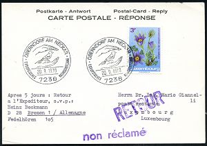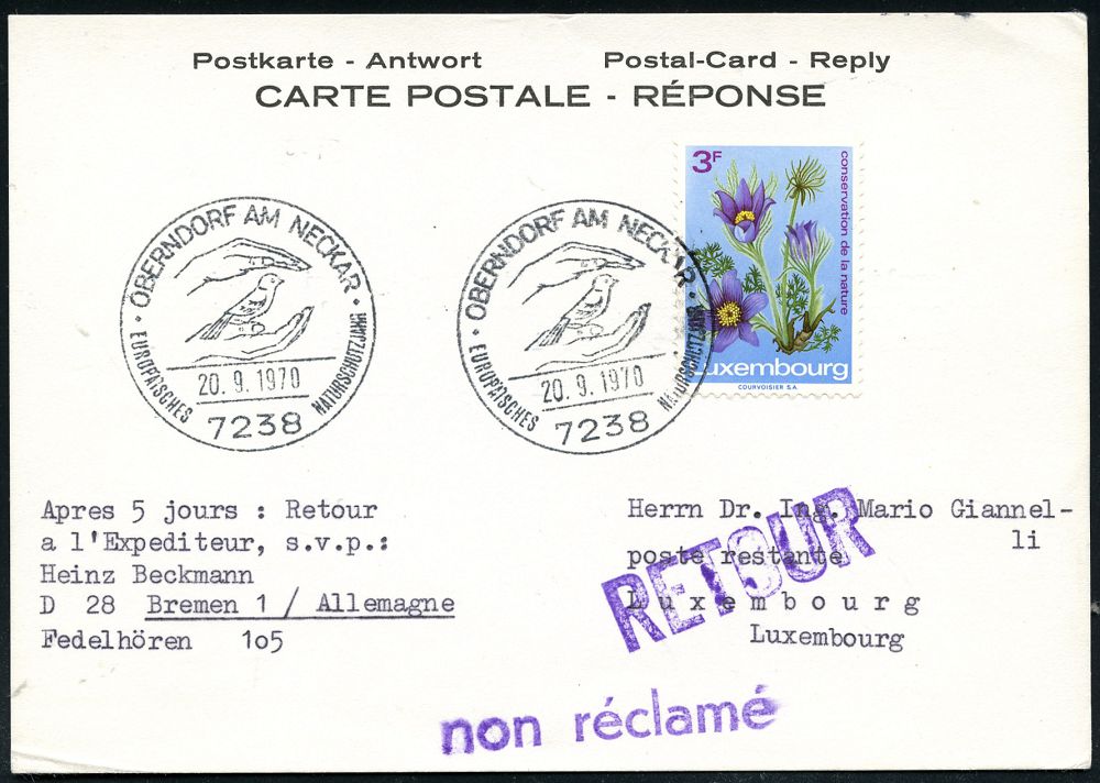 4316 | 18 € | POSTLEITRAUM 7200 (OHNE TUTTLINGEN) : 7238 OBERNDORF AM NECKAR/ EUROP.NATURSCHUTZJAHR 1970 (20.9.) SSt (2 Hände schützen Vogel) auf EF 3 F. Luxemburg "Naturschutz" auf zulässiger Ausl.-Antwort-Retour-Kt. n. Luxembourg!, Unikat! (Bo.8) | ![]() | |