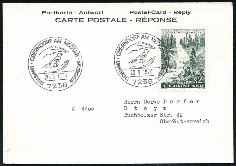 4317 | 18 € | POSTLEITRAUM 7200 (OHNE TUTTLINGEN) : 7238 OBERNDORF AM NECKAR/ EUROP.NATURSCHUTZJAHR 1970 (20.9.) SSt (2 Hände schützen Vogel) auf EF Österreich 2 S. "Europ. Naturschutz", zulässige Ausl.-Antwort-Kt. n. Österreich!, Unikat! (Bo.8) | ![]() | |