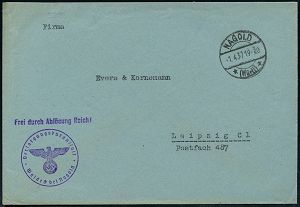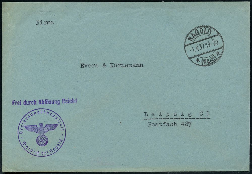 4303 | 15 € | POSTLEITRAUM 7200 (OHNE TUTTLINGEN) : NAGOLD/ *(Württ)* 1937 (1.4.) 1K-Brücke + HdN: FdAR !/Versorgungsanstalt/Waldeck bei Nagold (NS-Adler) klar gest. Inl.-Dienst-Bf. | ![]() | |