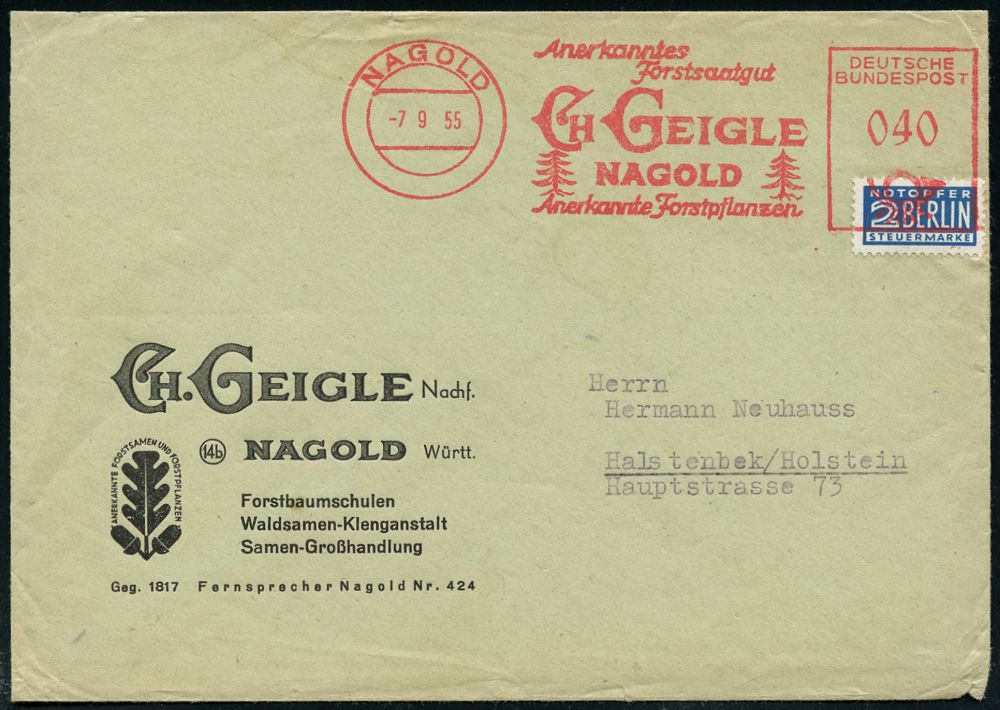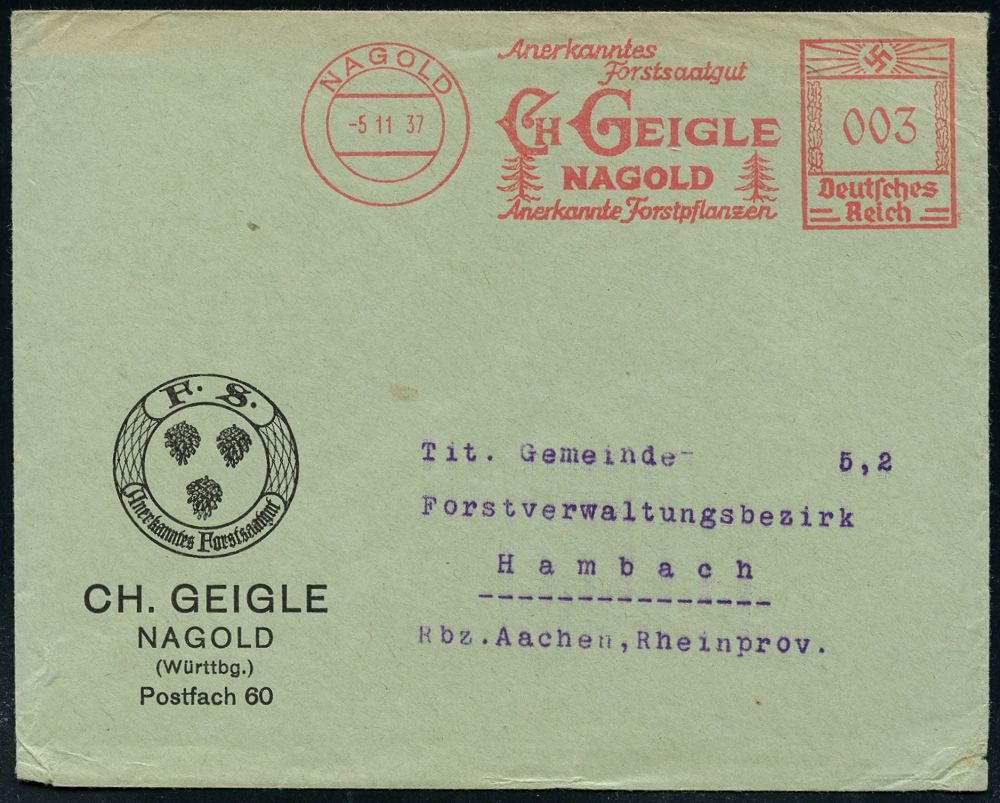 4304 | 18 € | POSTLEITRAUM 7200 (OHNE TUTTLINGEN) : NAGOLD/ Anerkanntes/ Forstsaatgut/ CH GEIGLE.. 1937 (2.3.) AFS Francotyp "Hakenkreuz" = 2 Tannen auf dekoratiiver Firmen-Bf. mit Firmen-Logo = 3 Tannenzapfen, (Dü.E-3CEo) | ![]() ![]() | |