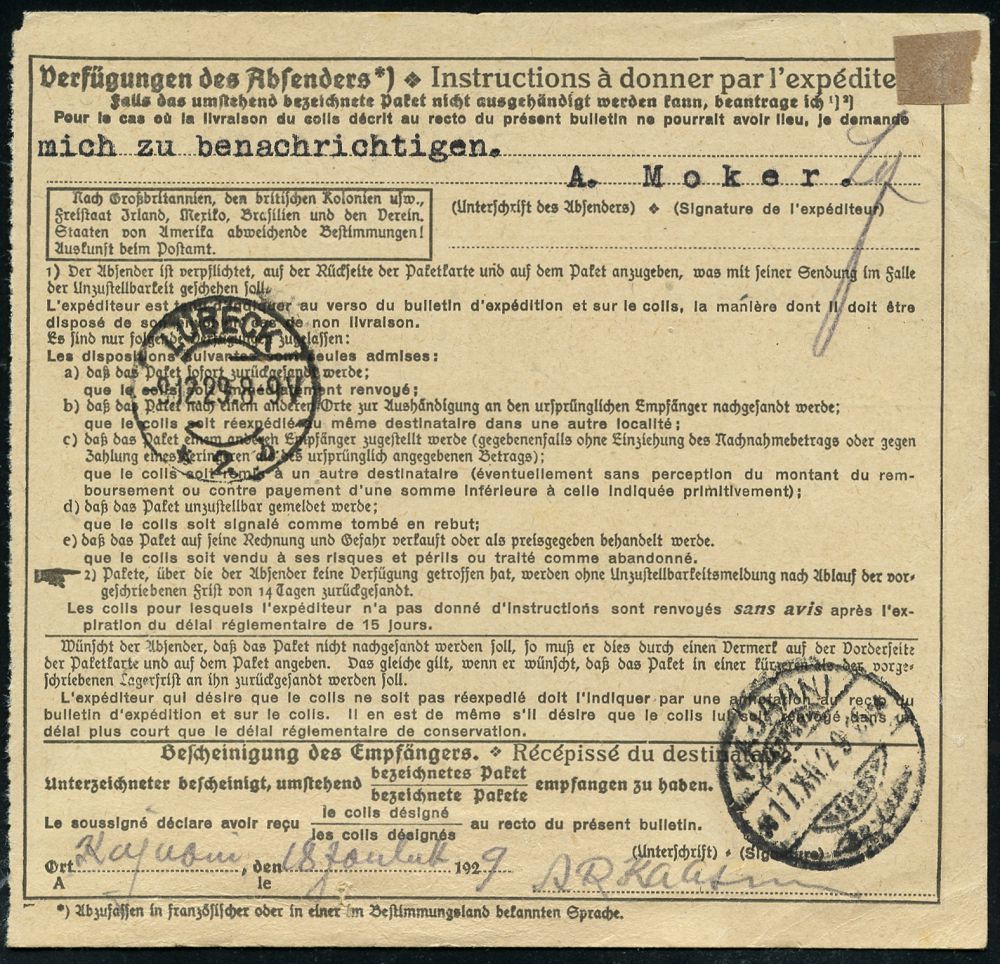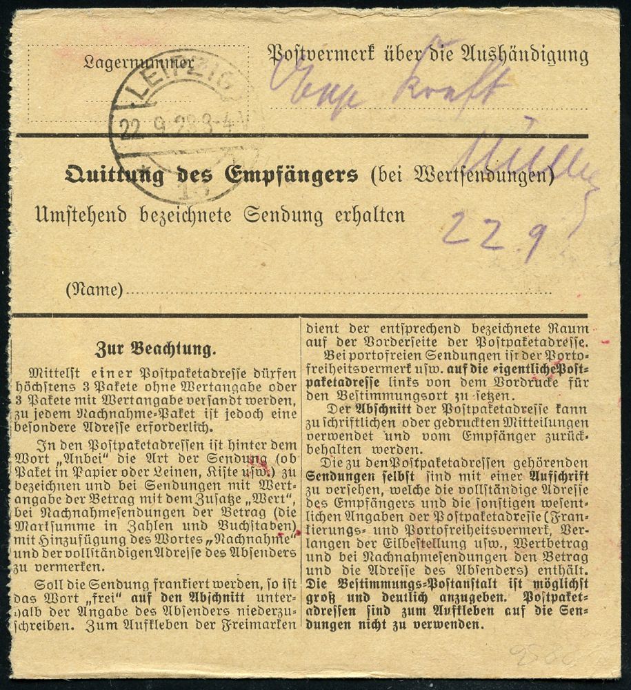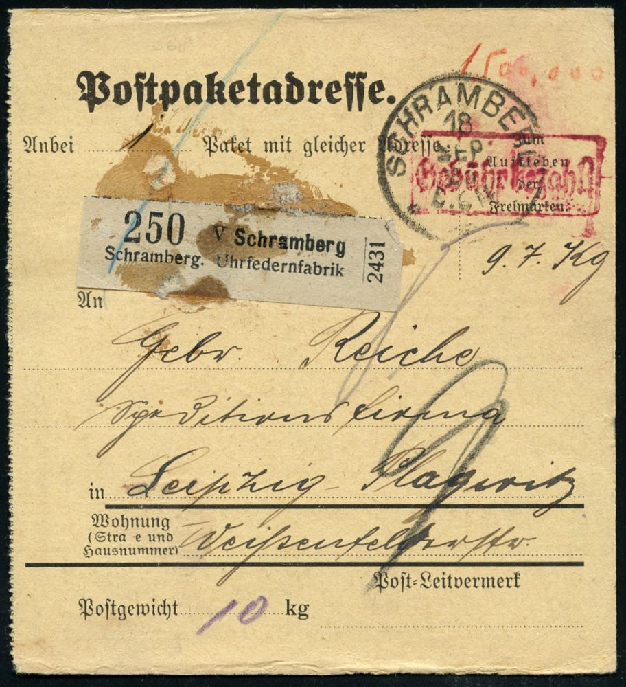 4339 | 25 € | POSTLEITRAUM 7200 (OHNE TUTTLINGEN) : SCHRAMBERG 1923 (18.9.) 1K + roter Ra.: Gebühr bezahlt + schw. Selbstbucher-Paketzettel: Schramberg/ Schramberg. Uhrfedernfabrik (Leimfleck) seltene Inl.-Infla-Selbstbucher-Paketkarte n. Leipzig | ![]() ![]() | |