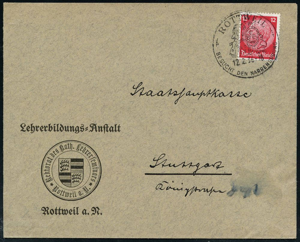 4325 | 18 € | POSTLEITRAUM 7200 (OHNE TUTTLINGEN) : ROTTWEIL/ BESUCHT DEN NARRENSPRUNG 1935 (7.2.) HWSt = 3 alemannische Holzmasken , klar gest. Dienst-Bf.: Lehrerbildungs-Anstalt.. (Bo.1) | ![]() | |