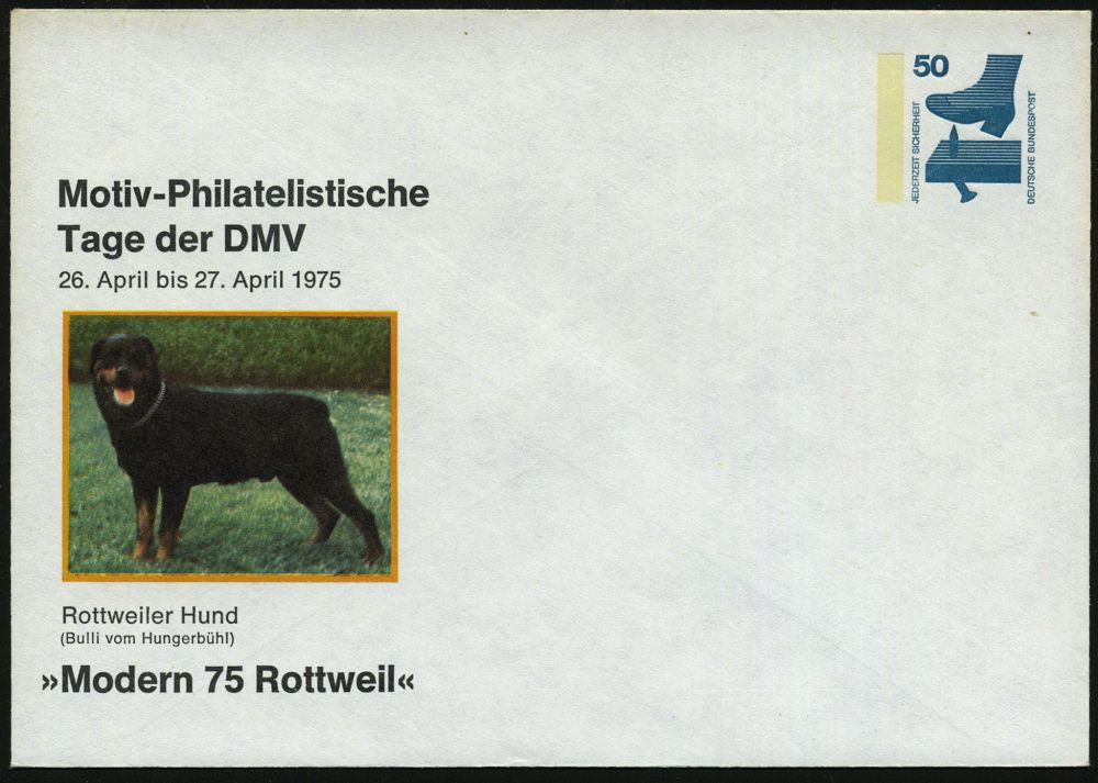 4331 | 10 € | POSTLEITRAUM 7200 (OHNE TUTTLINGEN) : Rottweil 1975 (Apr.) PU 50 Pf. Unfall: ..Tage der DMV.. Rottweiler Hund (Rottweiler) ungebr. (Mi.PU 68/8) | ![]() | |