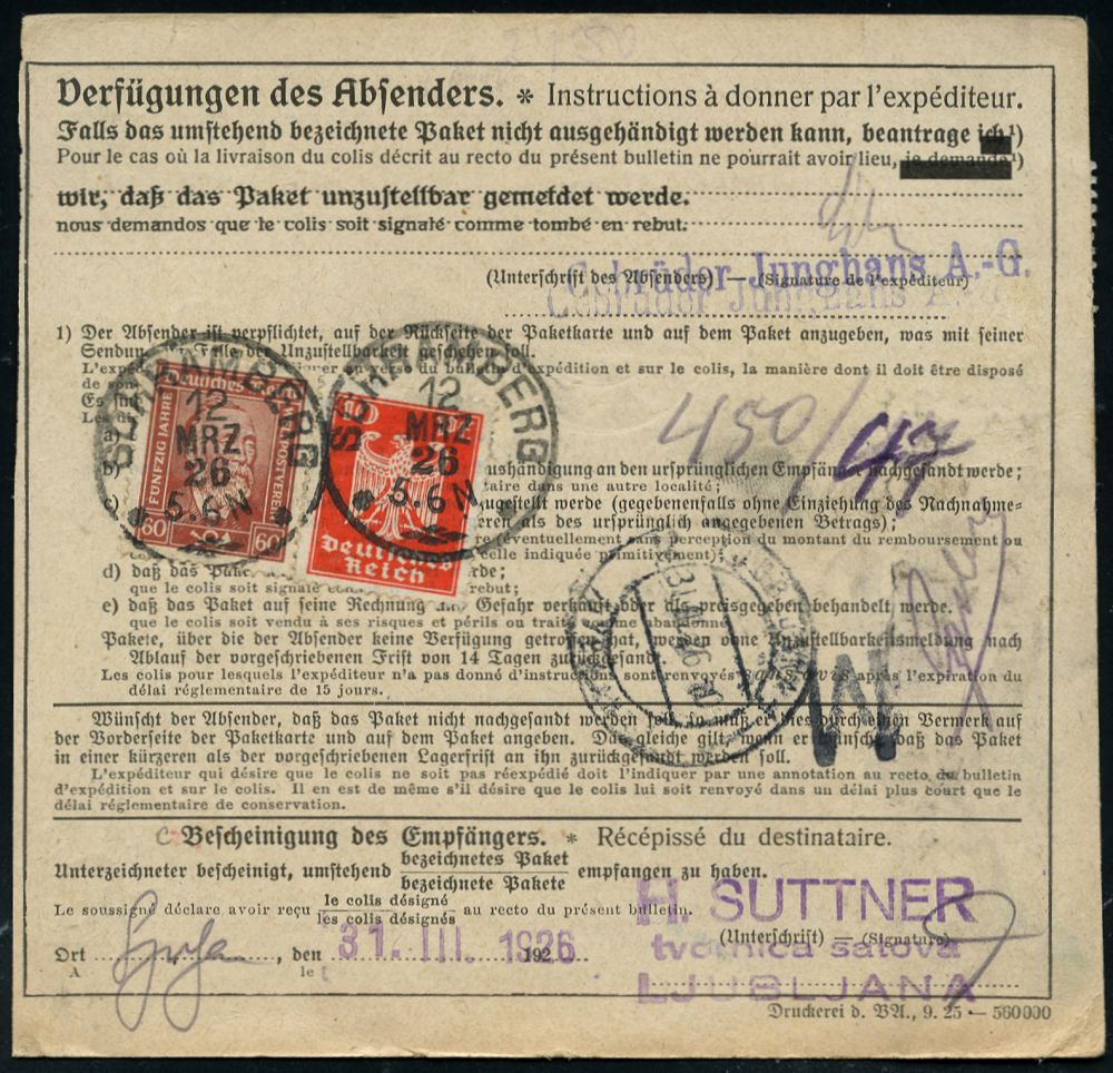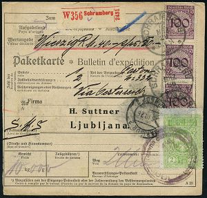 4340 | 25 € | POSTLEITRAUM 7200 (OHNE TUTTLINGEN) : SCHRAMBERG/ ** 1929 (12.3.) 1K auf senkr. 3er-Streifen 100 Pf. Korbdeckel (wie MeF + rs. Zusatzfrankat. 70 Pf.) + roter Wertpaketzettel: Schramberg + jugoslaw. Fiskalmarke 2 Din., Ausl.-Wertpaketkt. n. Ljubljana (Mi.3x 343, rs. 357, 362) | ![]() ![]() | |