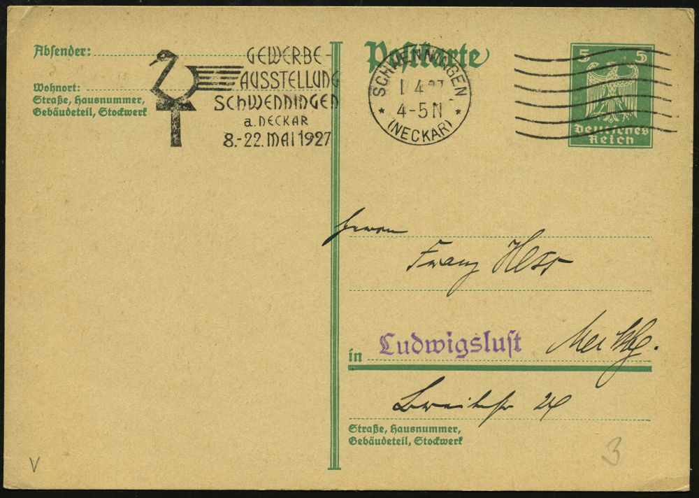 4355 | 18 € | POSTLEITRAUM 7200 (OHNE TUTTLINGEN) : SCHWENNINGEN/ *(NECKAR)*/ GEWERBE-/ AUSSTELLUNG/ ..8.-22.MAI 1927 (1.4.) MWSt + 6 Wellen rechts = stilis. Schwan (= Wappentier der Stadt, Hammer) glasklar gest. Inl.-Karte (Bo.3 C) | ![]() | |