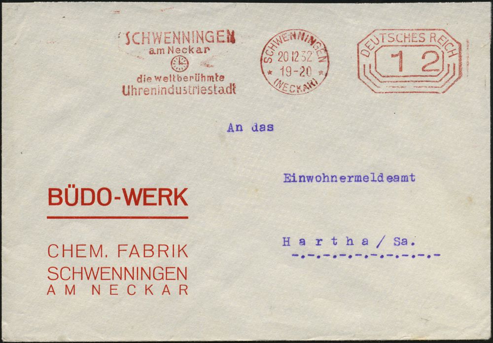 4360 | 35 € | POSTLEITRAUM 7200 (OHNE TUTTLINGEN) : SCHWENNINGEN/ *(NECKAR)*/ die weltberühmte/ Uhrenindustriestadt 1932 (20.12.) PFS Achteck "DEUTSCHES REICH", einzeilig 12 Pf. = Fernbfrief-Porto (Werbung links, Abb.: Zifferblatt) seltener Firmen-Bf.: BÜDO-WERK (= Schuhputzmittel, vergl. Kat.-Nr.4358) (Dü.5 G) | ![]() | |