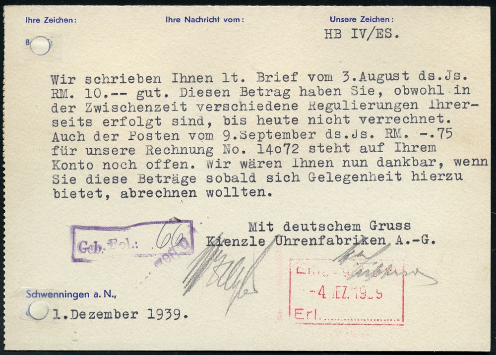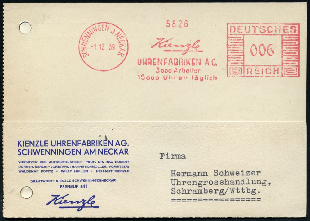 4367 | 18 € | POSTLEITRAUM 7200 (OHNE TUTTLINGEN) : SCHWENNINGEN a NECKAR/ Kienzle/ UHRENFABRIKEN AG/ 3000 Arbeiter/ 15000 Uhren täglich 1939 (Dez.) AFS Francotyp "Mäanderrechteck" klar auf Firmen-Kt. (Reg.-Lochung geschl.) n. Schramberg (Dü.E-2CEh) | ![]() ![]() | |