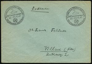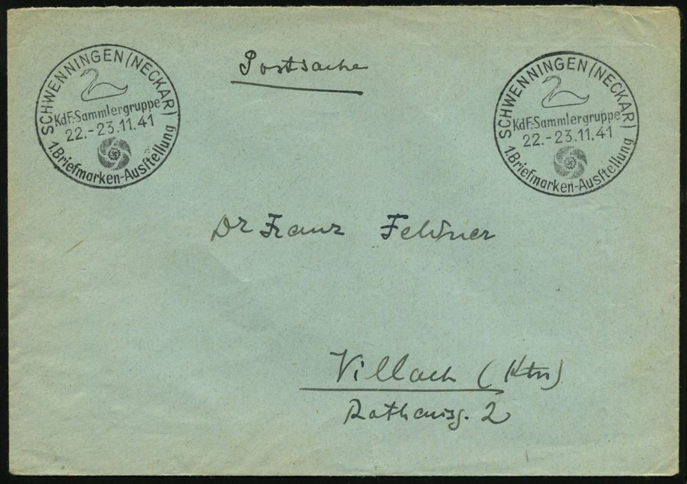 4371 | 18 € | POSTLEITRAUM 7200 (OHNE TUTTLINGEN) : SCHWENNINGEN (NECKAR)/ KdF-Sammlergruppe/ 1.Briefmarken-Ausstellung 1941 (Nov.) SSt = Schwan (= Stadtwappen) 2x auf Postdienstbf. (unten kl., unsichtbarer Riß) glasklar gest.! (Bo.10) | ![]() | |
