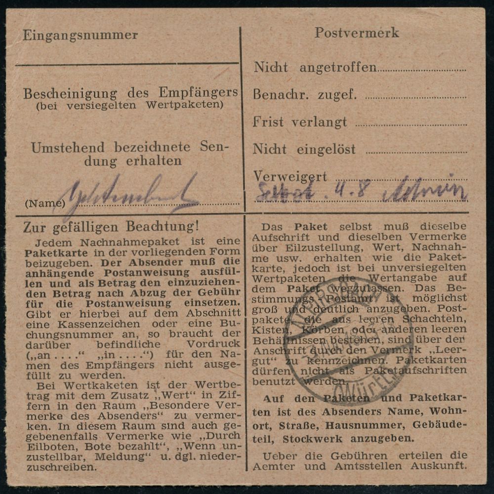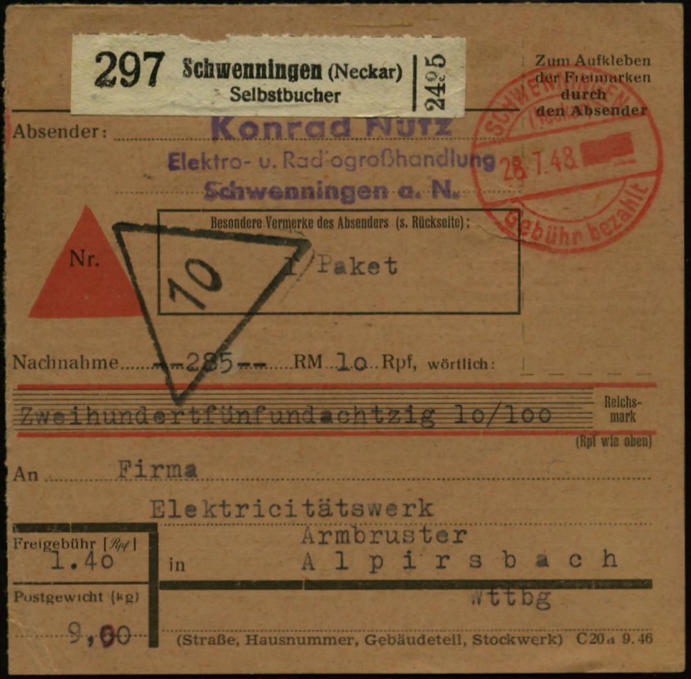 4378 | 18 € | POSTLEITRAUM 7200 (OHNE TUTTLINGEN) : SCHWENNINGEN/ (Neckar)/ Gebühr bezahlt 1948 (28.7.) 1K-Brücken-PFS mit geblockter Wertziffer + schw. Selbstbucher-Paketzettel: Schwenningen (Neckar)/Selbstbucher (= Konrad Nutz) + NN-Dreieck "19", Inl.-NN-Selbstbucher-Paketkt. (Dü.A-6, Nr.25) | ![]() ![]() | |