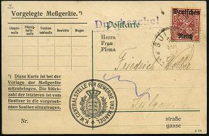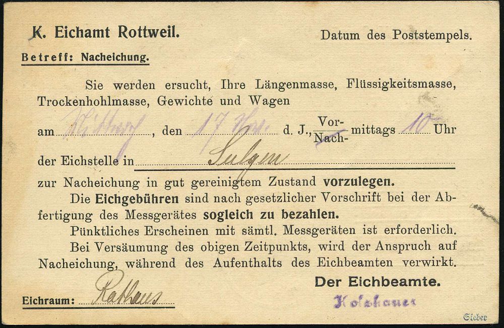 4389 | 45 € | POSTLEITRAUM 7200 (OHNE TUTTLINGEN) : SULGEN/ O.A.OBERNDORF 1920 (16.11.) 1K auf EF 10 Pf. Württemberg Dienst "Abschied", Dienst-Kt.: K. Eichamt Rottweil , gedrucktes Dienstsiegel: K. W. CENTRALSTELLE FÜR GEWERBE U. HANDEL, Aufforderung zur Eichung von Meßgeräten, Fern-Kt., seltene Frankatur! (Mi.D 58 EF, + 100.- EUR) | ![]() ![]() | |
