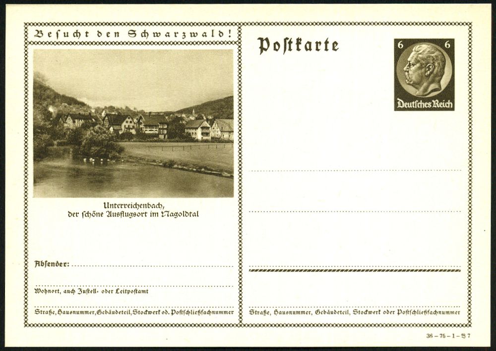 4396 | 10 € | POSTLEITRAUM 7200 (OHNE TUTTLINGEN) : Unterreichenbach 1936 6 Pf. BiP Hindenbg., braun, Sonderform: "Besucht den Schwarzwald!" , ungebr. (Mi.P 236/36-75) | ![]() | |