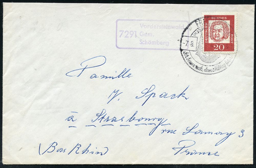 4398 | 15 € | POSTLEITRAUM 7200 (OHNE TUTTLINGEN) : 7291 Vordersteinwald/ Gem./ Schömberg 1964 (7.8.) viol. Ra.3 = PSt.II + aptierter HWSt.: FREUDENSTADT/..der Sonne nah.. = alte PLGZ entfernt , klar gest. selten auf Auslands-Bf.! (Bo.14 aptiert) | ![]() | |
