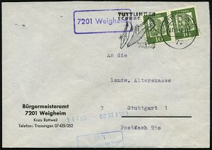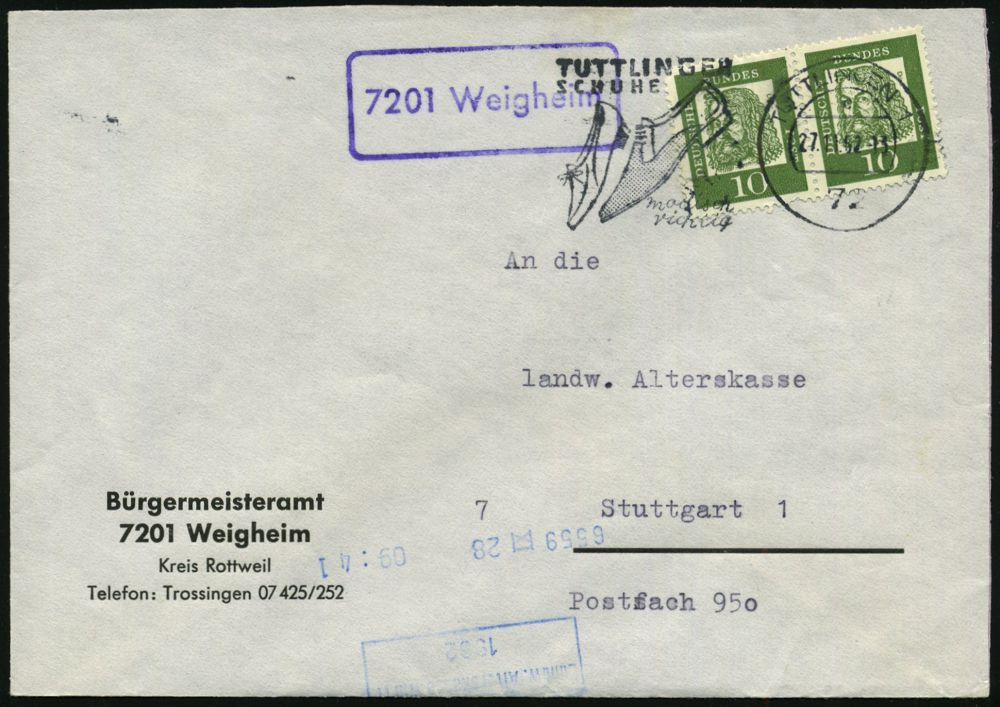 4400 | 14 € | POSTLEITRAUM 7200 (OHNE TUTTLINGEN) : 7201 Weigheim 1962 (27.11.) viol. Ra. = PSt.II + MWSt.: 72 TUTTLINGEN 1/a/SCHUHE.. (Damen- u. Herren-Halbschuh) Dienst-Bf.: Bürgermeisteramt 7201 Weigheim.., Fern-Bf. (Bo.9 A II = Erstjahr!) | ![]() | |