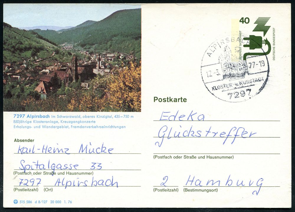 4219 | 14 € | POSTLEITRAUM 7200 (OHNE TUTTLINGEN) : 7297 ALPIRSBACH/ ..KLOSTER-u.KURSTADT 1977 (17.3.) HWSt (Kloster) auf ortsgl. BiP 40 Pf. Unfall: 7297 Alpirsbach.. Klosteranlage, Kreuzgangkonzerte.. (Mi.P 120) Bedarf, seltene Kombination! (Bo.5 Ty.I) | ![]() | |