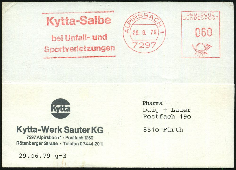 4220 | 10 € | POSTLEITRAUM 7200 (OHNE TUTTLINGEN) : 7297 ALPIRSBACH 1/ Kytta-Salbe/ bei Unfall-u./ Sportverletzungen 1979 (29.6.) AFS Francotyp "Posthorn" , klar gest. Firmen-Kt. mit Firmen-Logo (Dü.E-26) | ![]() | |