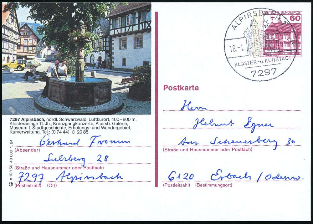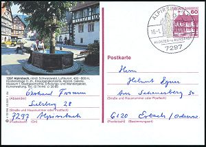 4221 | 14 € | POSTLEITRAUM 7200 (OHNE TUTTLINGEN) : 7297 ALPIRSBACH 1/ KLOSTER- u.KURSTADT 1985 (Jan.) HWSt (Abtei) ortsgl. BiP 60 Pf. Burgen: 7297Alpirsbach.. Klosteranlage 11 Jh., Kreuzgangkonzerte.. (Mi.P 138) seltene Kombination! (Bo.5) | ![]() | |