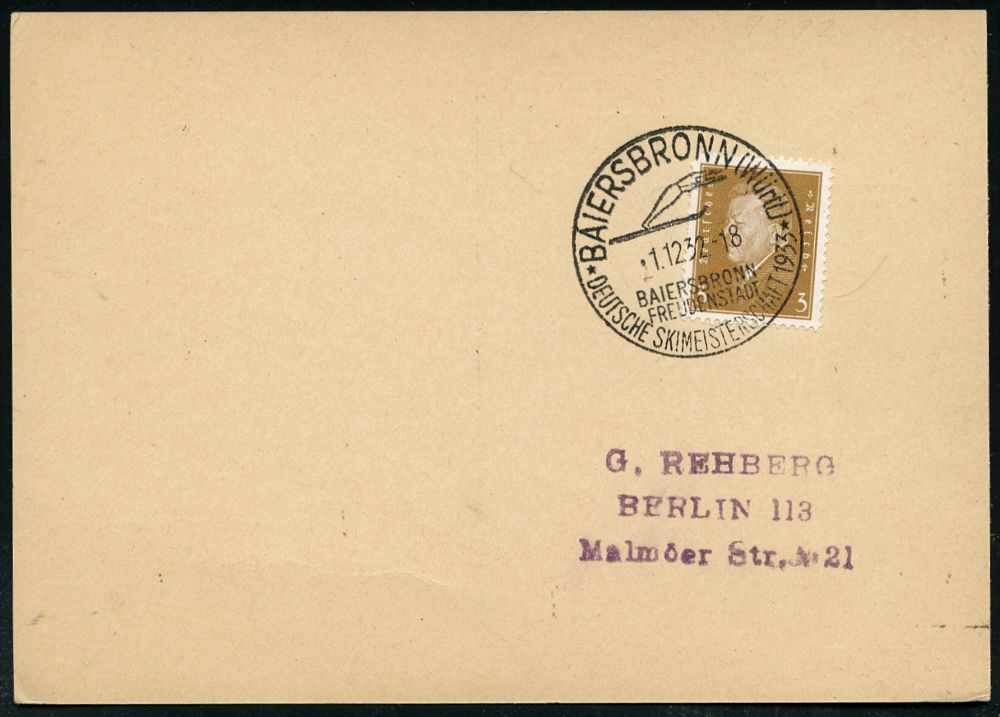 4230 | 16 € | POSTLEITRAUM 7200 (OHNE TUTTLINGEN) : BAIERSBRONN (Württ)/ DEUTSCHE SKIMEISTERSCHAFT 1933 1932 (1.12.) HWSt (Skispringer) klar gest. Inl.-Karte (Bo.1) | ![]() | |