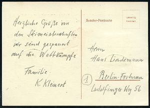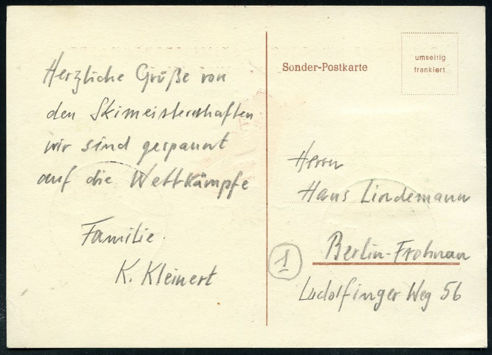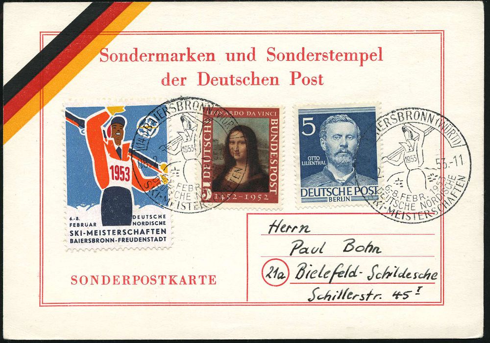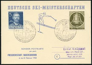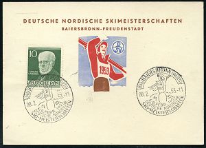 4233 | 25 € | POSTLEITRAUM 7200 (OHNE TUTTLINGEN) : (14b) BAIERSBRONN (WÜRTT)/ DEUTSCHE NORDISCHE/ SKI-MEISTERSCHAFTEN 1953 (8.2.) SSt (Ski-Sportler mit geschulterten Sik) rs. auf motivgl. Sonder-Kt. = Michaelis unbekannt!, n. West-Berlin (Bo.3) | ![]() ![]() | |