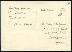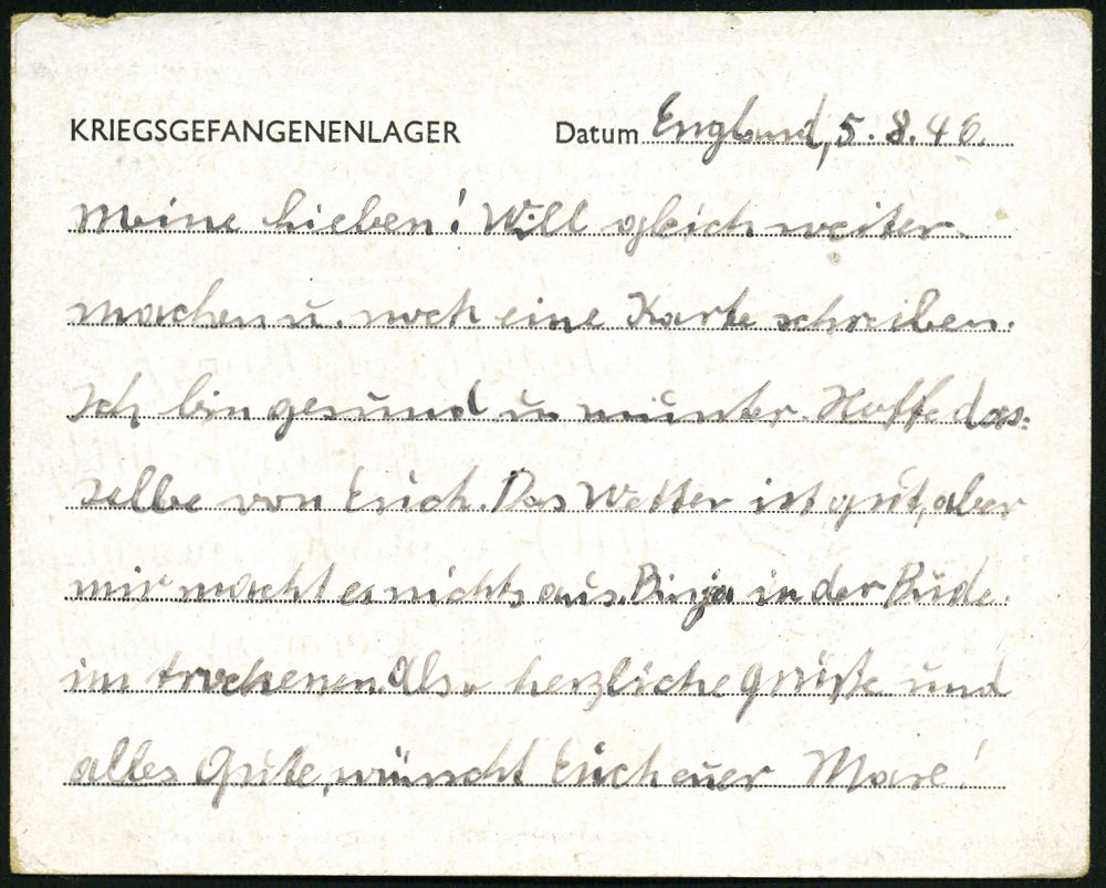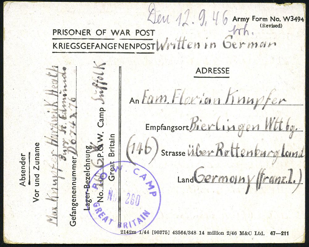 4235 | 16 € | POSTLEITRAUM 7200 (OHNE TUTTLINGEN) : Bierlingen über Rottenburg 1946 (5.8.) viol. 1K: P. O. W. CAMP/No. 260/ GREAT BRITAIN = G.P.W.W. Camp Suffolk , Vordruck-Karte: KRIEGSGEFANGENENLAGER (Army Form No W 3494/ (Revised) aus Großbritannien n. Bierlingen | ![]() ![]() | |