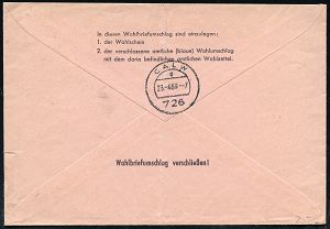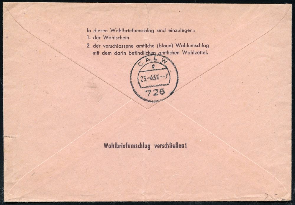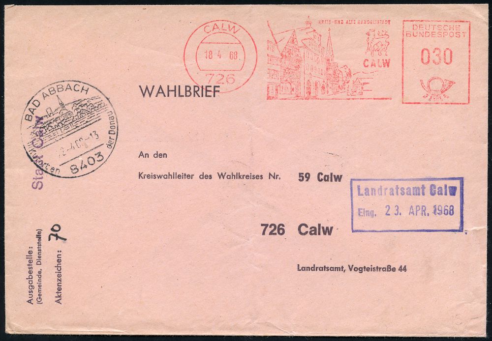 4241 | 16 € | POSTLEITRAUM 7200 (OHNE TUTTLINGEN) : 726 CALW/ KREIS- U.ALTE HANDELSSTADT 1968 (18.4.) AFS Francotyp "Posthorn" 030 Pf. auf rosa W a h l B r i e f für Briefwahl aus 8403 BAD ABBACH (HWSt.) + Eingangs-Ra.2: Landratsamt Calw + rs. AS., seltene Verwendung! (Dü.E-23CO) | ![]() ![]() | |