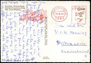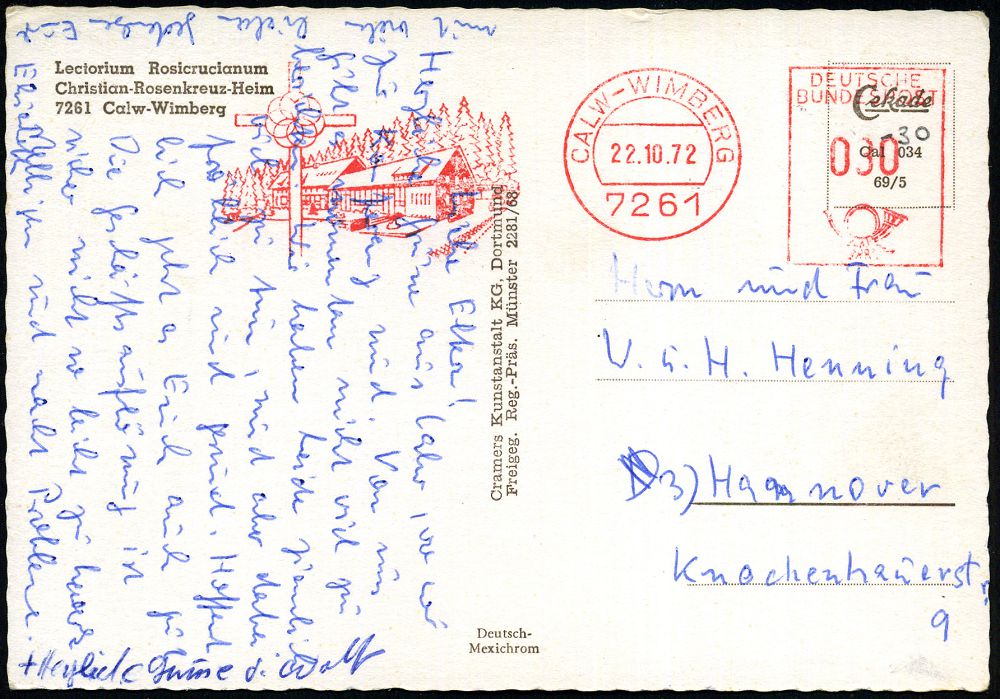 4243 | 18 € | POSTLEITRAUM 7200 (OHNE TUTTLINGEN) : 7261 CALW-WIMBERG (CHRISTIAN ROSENKREUZ-HEIM) 1972 (22.10.) stummer AFS Francotyp mit Abb.: Christian Rosenkreuz-Heim mit Rosenkreuz = Hauspostamt Lectorium Rosicrucianum , motiv-ähnl. Color-Ak. von einem Konferenz-Teilnehmer = Fremdnutzung eines Absender-Freistemplers (sonst unzulässig), seltener Beleg! (Dü.E-26) | ![]() ![]() | |