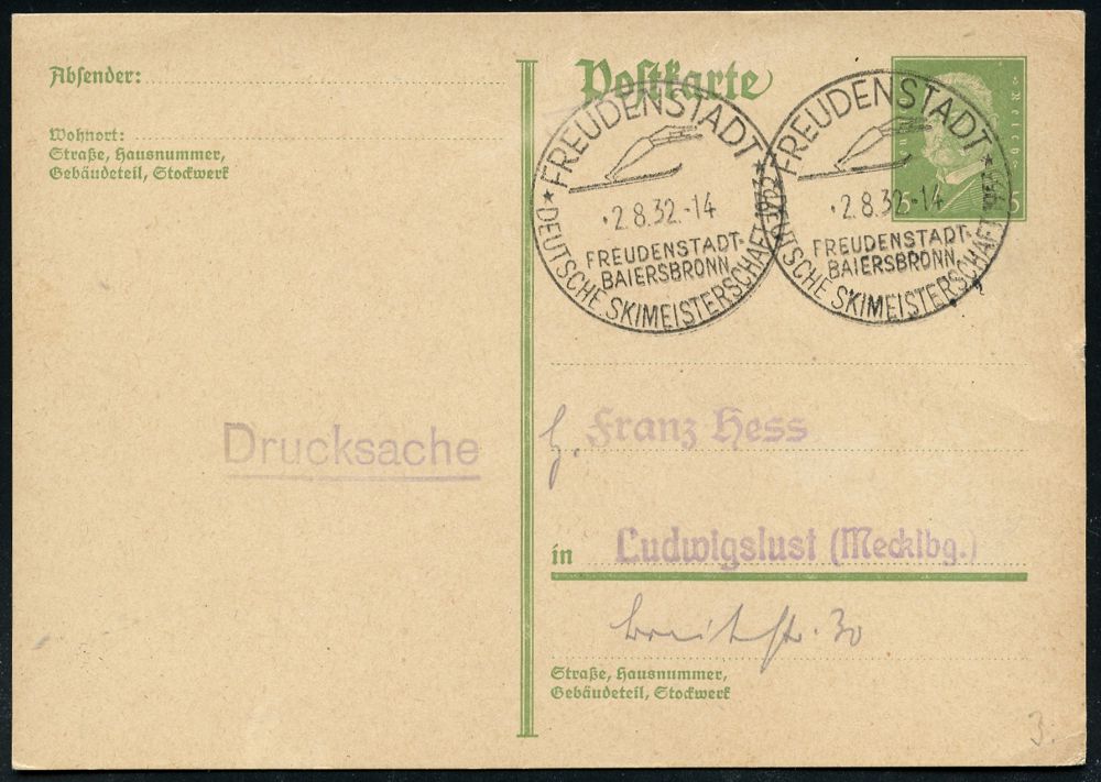 4255 | 18 € | POSTLEITRAUM 7200 (OHNE TUTTLINGEN) : FREUDENSTADT/ ..DEUTSCHE SKIMEISTERSCHAFTEN 1933 1932 (2.8.) HWSt (Skispringer) 2x klar auf Inl.-Karte (Bo.3) | ![]() | |