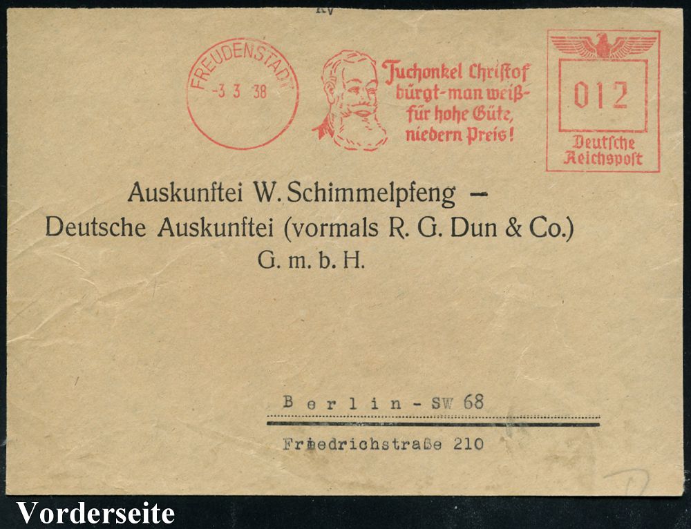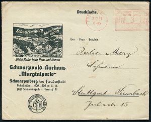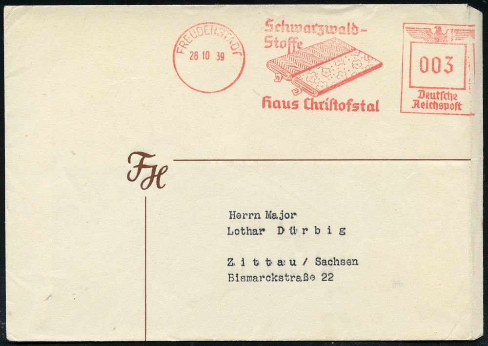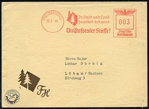 4260 | 20 € | POSTLEITRAUM 7200 (OHNE TUTTLINGEN) : FREUDENSTADT/ Jn Stadt u.Land../ Christofstaler Stoffe! 1939 (22.2.) AFS Francotyp "Reichsadler" (Logo: 2 Tannen) motivgl. Firmen-Bf. (Dü.E-5CGo) | ![]() ![]() | |