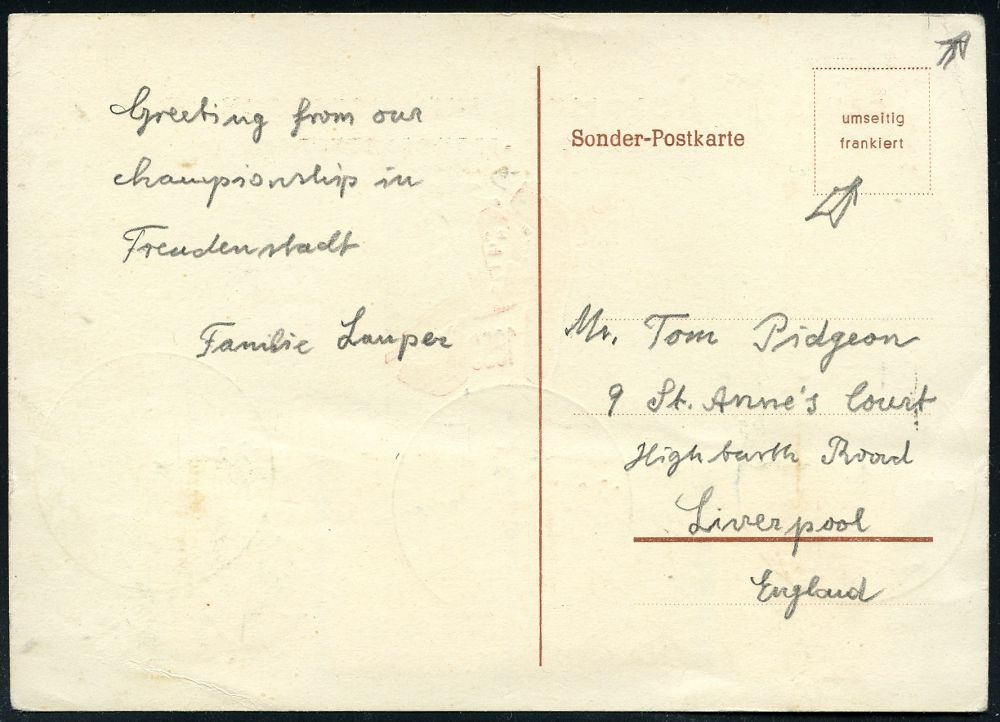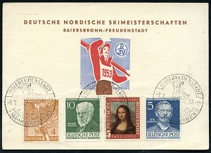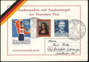 4267 | 20 € | POSTLEITRAUM 7200 (OHNE TUTTLINGEN) : (14b) FREUDENSTADT/ DEUTSCHE NORDISCHE/ SKI-MEISTERSCHAFTEN 1953 (7.3.) SSt (Skisportler mit Ski) 2x auf passender Inl.-Sonder-Kt. , Michaelis unbekannt! (Bo.9) | ![]() | |