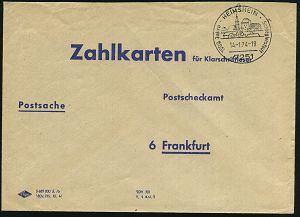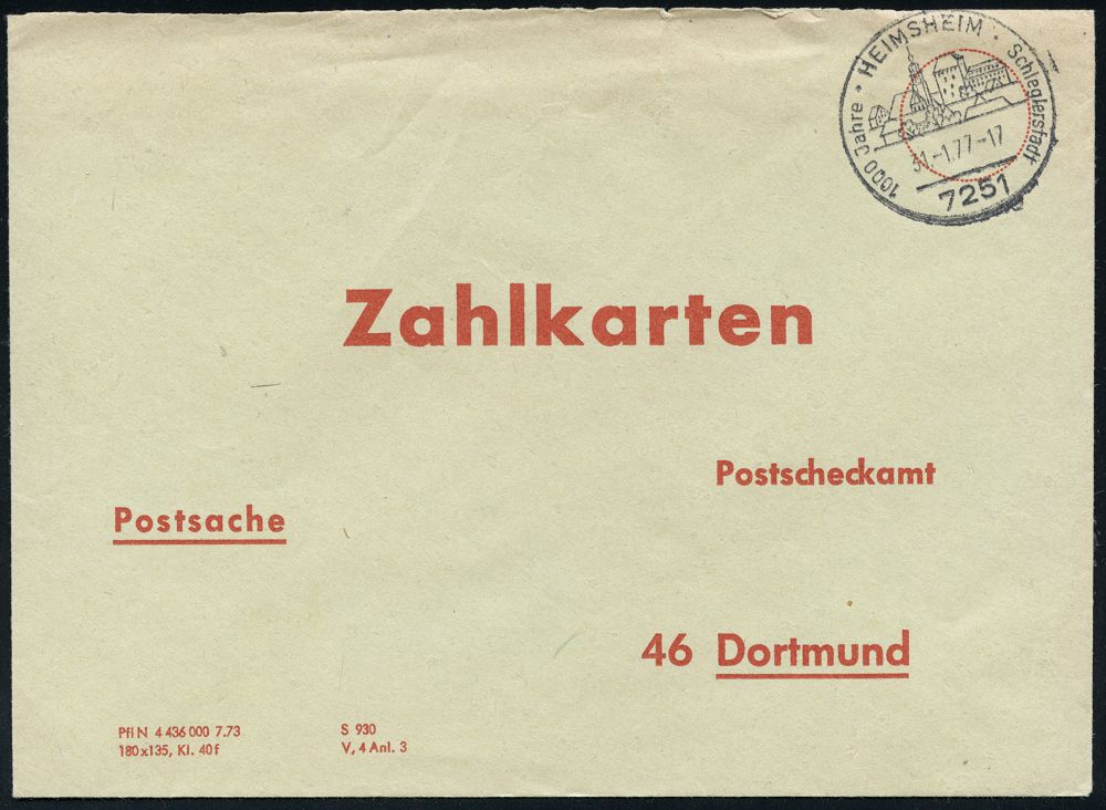 4280 | 16 € | POSTLEITRAUM 7200 (OHNE TUTTLINGEN) : 7251 HEIMSHEIM/ 1000 Jahre/ Schleglerstadt 1974 (14.1.) HWSt (Ortsbild), "Schlegler" = wehrhaftes Adels-Bündnis ab 14. Jhdt. , klar gest. Post-Innendienst-Bf.: Zahlkarten für Klarschriftleser.. Postscheckamt.. (blau/weiß), seltene Verwendung! (Bo.1) | ![]() | |