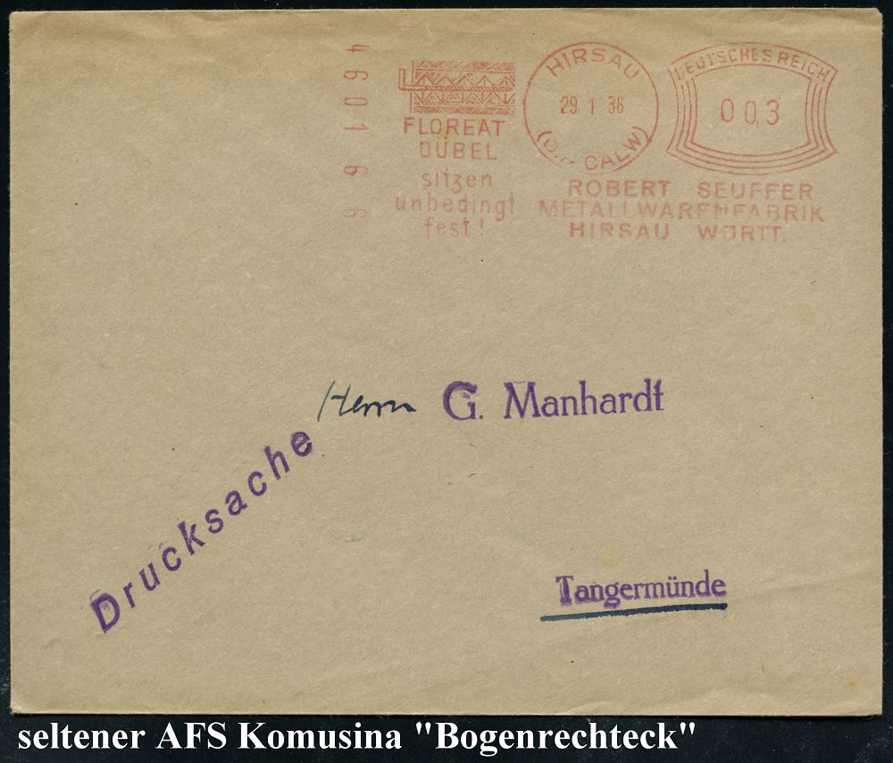 4283 | 25 € | POSTLEITRAUM 7200 (OHNE TUTTLINGEN) : HIRSAU/ (O.A.CALW)/ FLOREAT/ DÜBEL../ ROBERT SEUFFER 1936 (29.1.) seltener AFS Komusina "Bogenrechteck" (Wanddübel) klar gest. Inl.-Drs.-Bf. (Dü.E-1Komusina) | ![]() | |