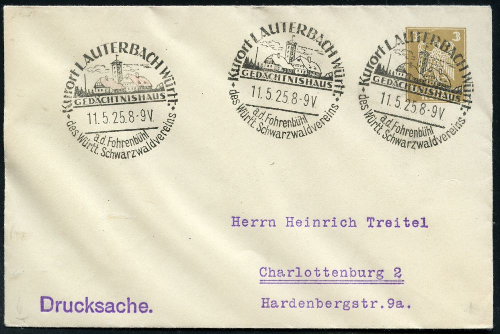 4288 | 20 € | POSTLEITRAUM 7200 (OHNE TUTTLINGEN) : LAUTERBACH Württ./ GEDÄCHTNISHAUS/ ..d.Württ.Schwarzwaldvereins 1925 HWSt (Turm-Haus des Schwarzwald-Vereins) 3x auf PU 3 Pf. Adler, braun (Treitel) klar gest. Inl.-Bf. (Bo.1, Erstjahr!) | ![]() | |