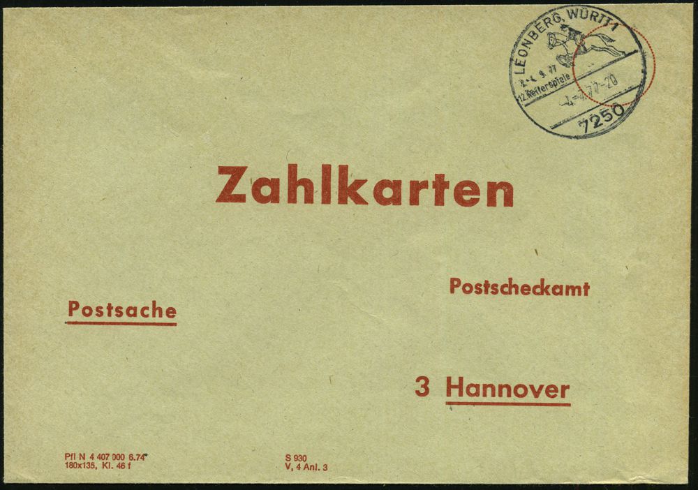 4296 | 16 € | POSTLEITRAUM 7200 (OHNE TUTTLINGEN) : 7250 LEONBERG,WÜRTT 1/ 12.Reiterspiele 1977 (4.7.) seltener HWSt = Springreiter auf Postscheck-Innendienst-Bf. "Zahlkarten.." (braun/ grün) für Zahlkartenaustausch!, seltene Verwendung! (Bo.31) | ![]() | |