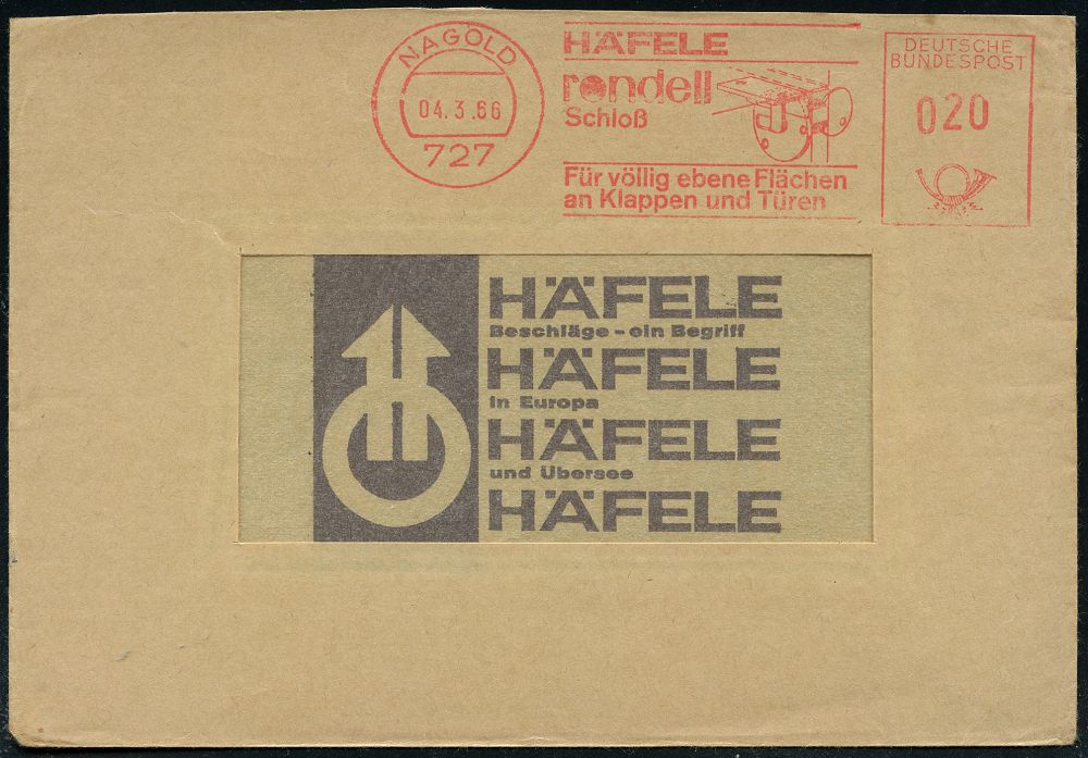4308 | 12 € | POSTLEITRAUM 7200 (OHNE TUTTLINGEN) : 727 NAGOLD/ HÄFELE/ rondell/ Schloß.. 1966 (4.3.) AFS Francotyp "Posthorn" (Holz-Scharnier) klar gest Reklame-Bf. (Dü.E-23CO) | ![]() | |