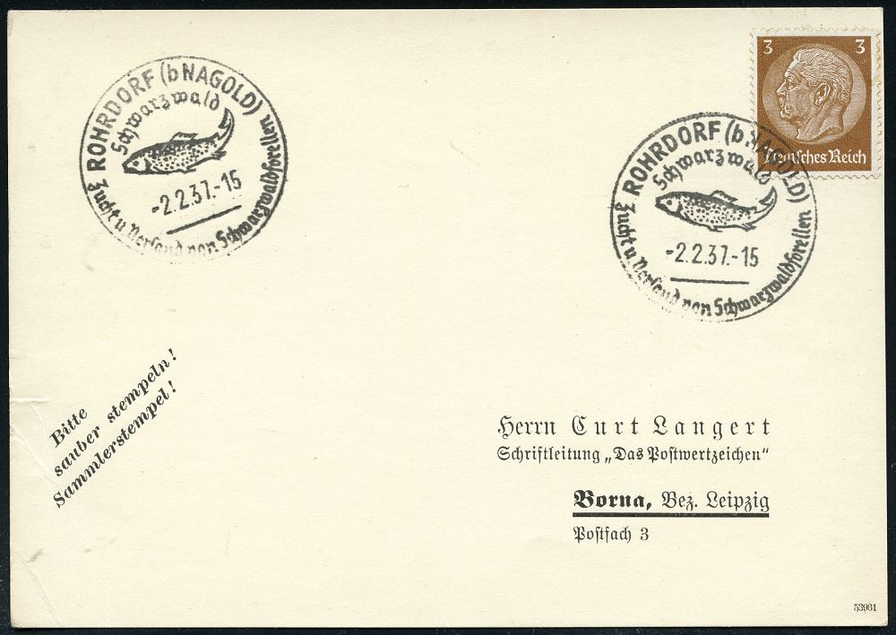 4323 | 16 € | POSTLEITRAUM 7200 (OHNE TUTTLINGEN) : ROHRDORF (b NAGOLD)/ Schwarzwald/ Zucht u.Versand v.Schwarzwaldforellen 1937 (2.2.) HWSt = Forelle (klar gest. Inl.-Karte (Bo.3) | ![]() | |