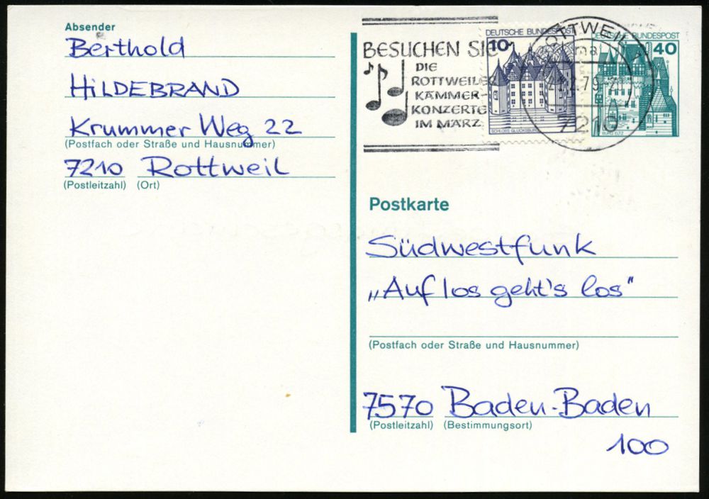 4333 | 6 € | POSTLEITRAUM 7200 (OHNE TUTTLINGEN) : 7210 ROTTWEIL 1/ ma/ ..ROTTWEILER/ KAMMER-/ KONZERTE 1979 (21.2.) MWSt (4 Noten) Bedarf | ![]() | |