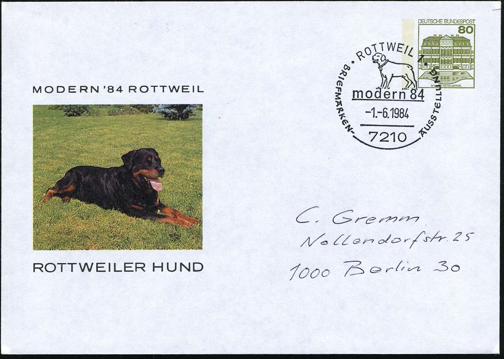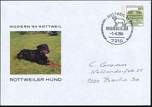 4336 | 10 € | POSTLEITRAUM 7200 (OHNE TUTTLINGEN) : 7210 ROTTWEIL 1/ modern 84.. 1984 (1.6.) SSt (Rottweiler) auf PU 80 Pf. Bauwerke, oliv: ROTTWEILER HUND (Mi.PU 117/164) | ![]() | |