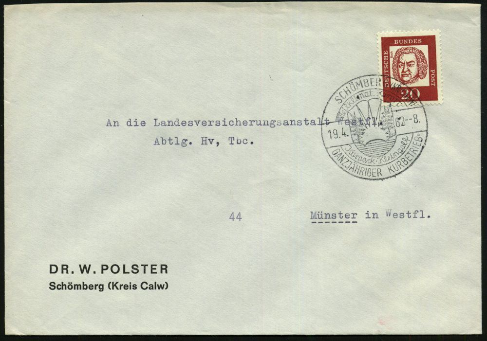 4337 | 12 € | POSTLEITRAUM 7200 (OHNE TUTTLINGEN) : SCHÖMBERG (KR CALW)/ Heilklimat.Kurort/ ..Kleingolf 1962 (19.4.) aptierter HWSt (= alte PLGZ entfernt) klar gest. Bedarfs-Bf.: DR. W. POLSTER.. (Bo.2 aptiert) | ![]() | |