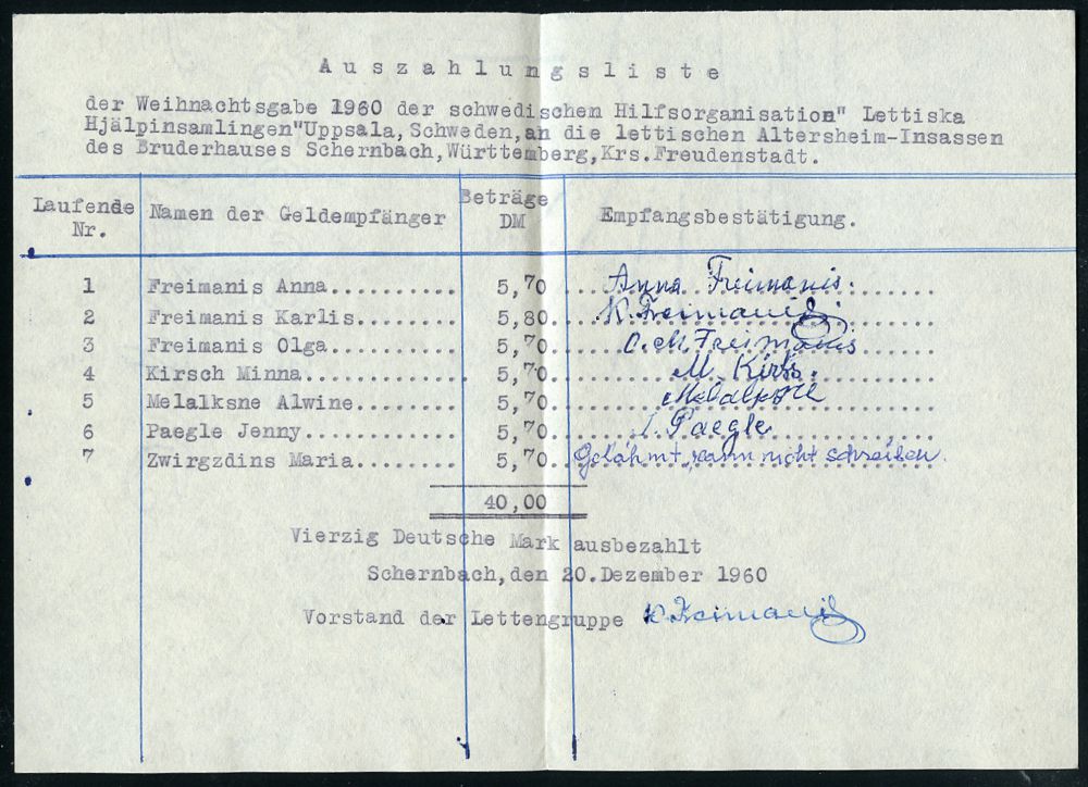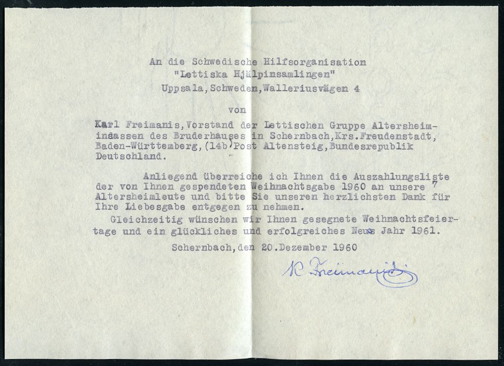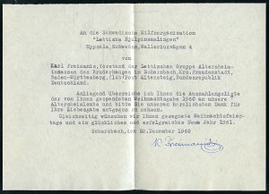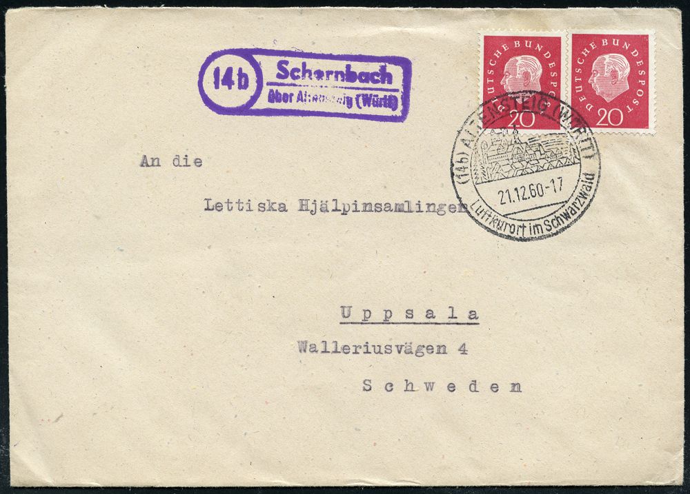 4338 | 25 € | POSTLEITRAUM 7200 (OHNE TUTTLINGEN) : (14b) Schernbach/ über Altensteig (Württ) 1960 (21.12.) viol. Ra.2 = PSt.II auf Auslandbf. an die schwedische baltische Hilfsorganisation "Lettiska Hjälpinsamlingen" (Lettland-Hilfe) mit Inhalt: Spendenliste + Anschreiben, 3 Belege des "Kalten Krieges" (Bo.2) | ![]() ![]() ![]() | |