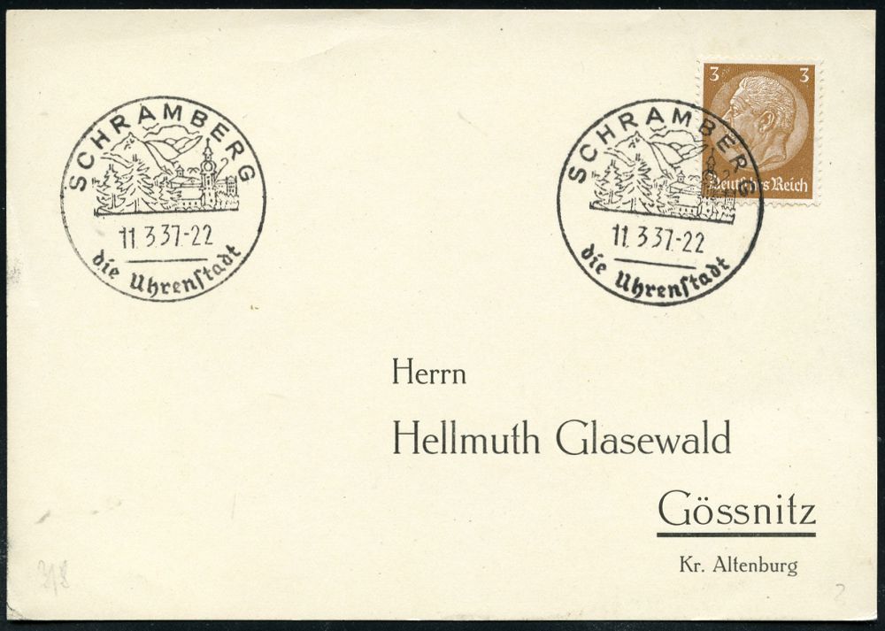 4343 | 15 € | POSTLEITRAUM 7200 (OHNE TUTTLINGEN) : SCHRAMBERG/ die Uhrenstadt 1937 (11.3.) HWSt (Ortsbild m.Kirche) klar gest. Inl.-Karte (Bo.3, Erstjahr) | ![]() | |