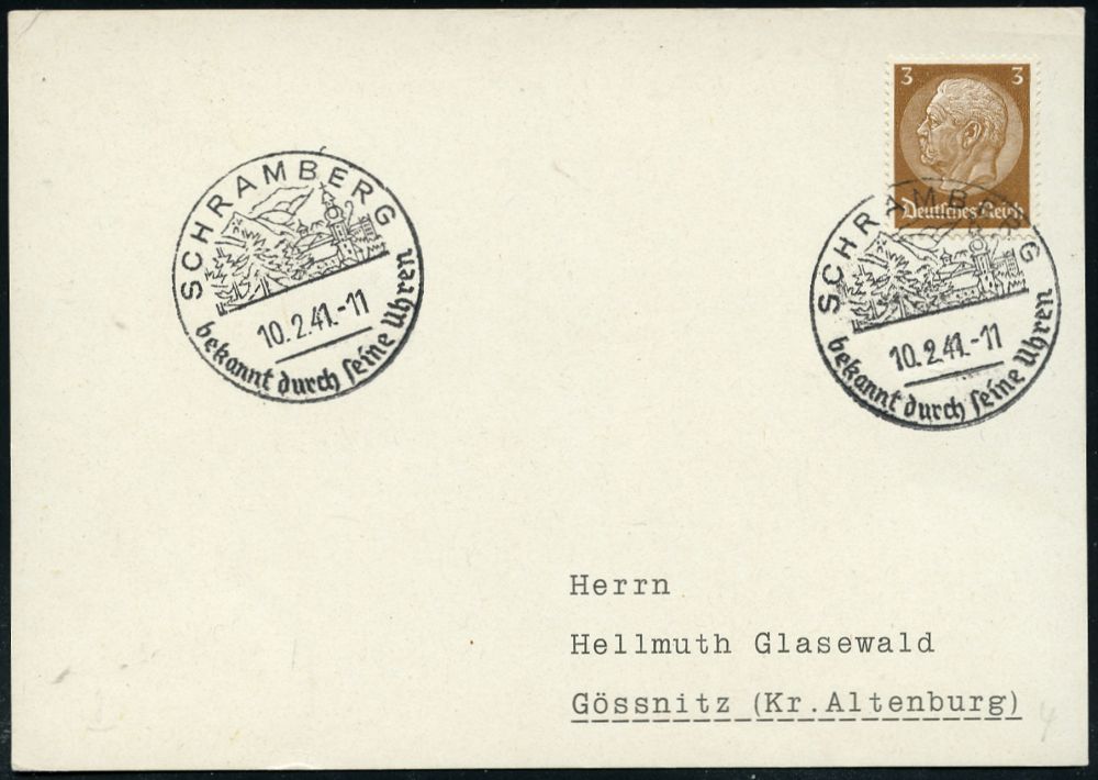 4344 | 16 € | POSTLEITRAUM 7200 (OHNE TUTTLINGEN) : SCHRAMBERG/ bekannt durch seine Uhren 1941 (10.2.) HWSt (Ortsbild m.Kirche) klar gest. Inl.-Karte, ex Glaswald-Slg. (Bo.4) | ![]() | |