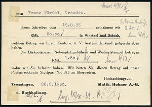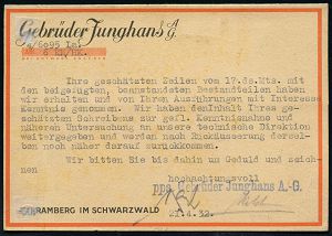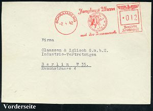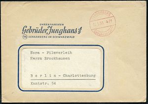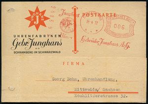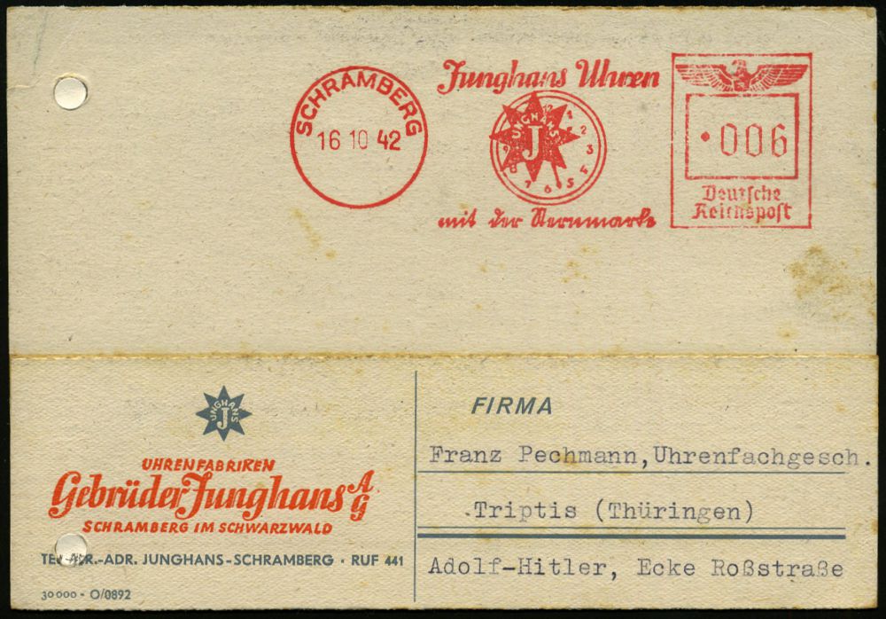 4345 | 20 € | POSTLEITRAUM 7200 (OHNE TUTTLINGEN) : SCHRAMBERG/ Junghans Uhren/ mit der Sternmarke 1942 (16.10.) AFS = Zifferblatt (m.Stern-Logo) Firmenkt. (Reg.-Lochung geschl., schwach fleckig) interess. Text: Einstellung der Uhrenproduktion für zivilen Bedarf, nur noch Kriegsproduktion!, Zeitgeschichte! (Dü.E-5DG) | ![]() | |