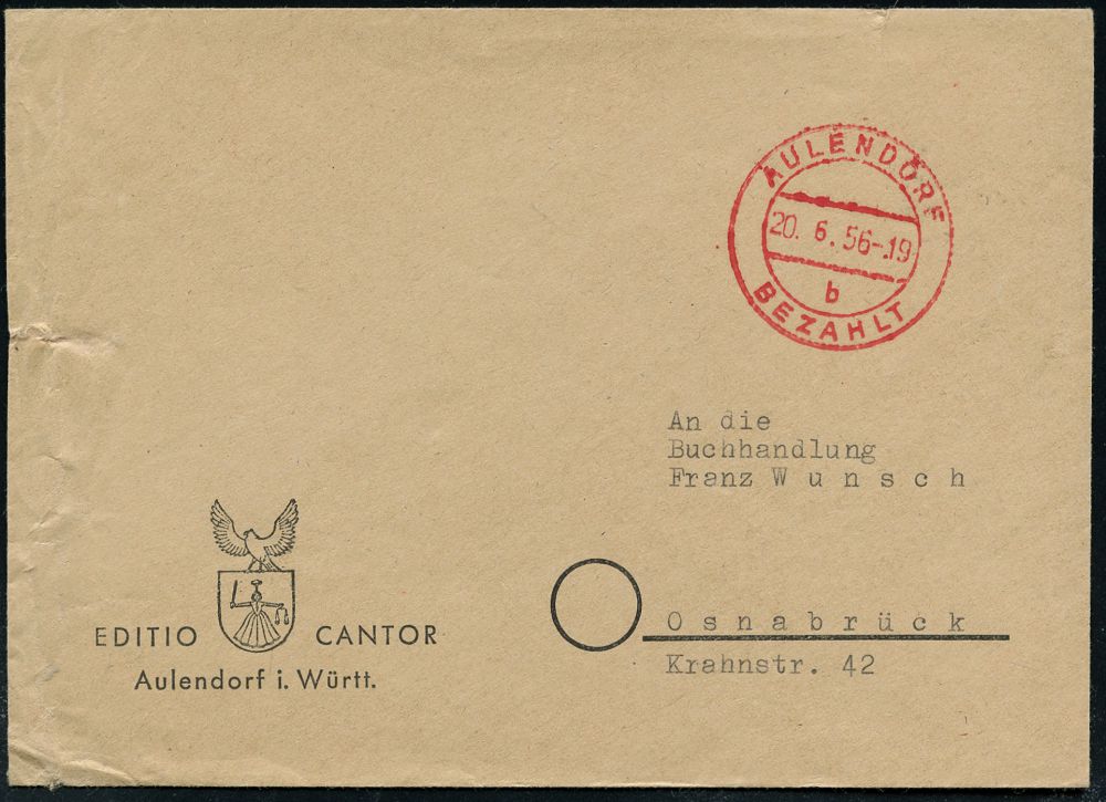 4223 | 12 € | POSTLEITRAUM 7200 (OHNE TUTTLINGEN) : AULENDORF/ b/ BEZAHLT 1956 (20.6.) 2K-Steg-PFS, große Form mit Uhrzeit auf Firmen-Bf.: EDITIO CANTOR.. (Dü.A-7, Nr.33) | ![]() | |