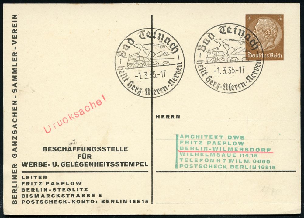 4228 | 18 € | POSTLEITRAUM 7200 (OHNE TUTTLINGEN) : Bad Teinach/ heilt Herz-Nerven-Nieren 1935 (1.3.) HWSt (Ortsbild) auf PP 3 Pf. Hindenbg., braun: BERLINER GANZSACHEN-SAMMLER-VEREIN (Mi.PP 122/B 16-04, + 12.- EUR) klar gest.! (Bo.2, Erstjahr) | ![]() | |