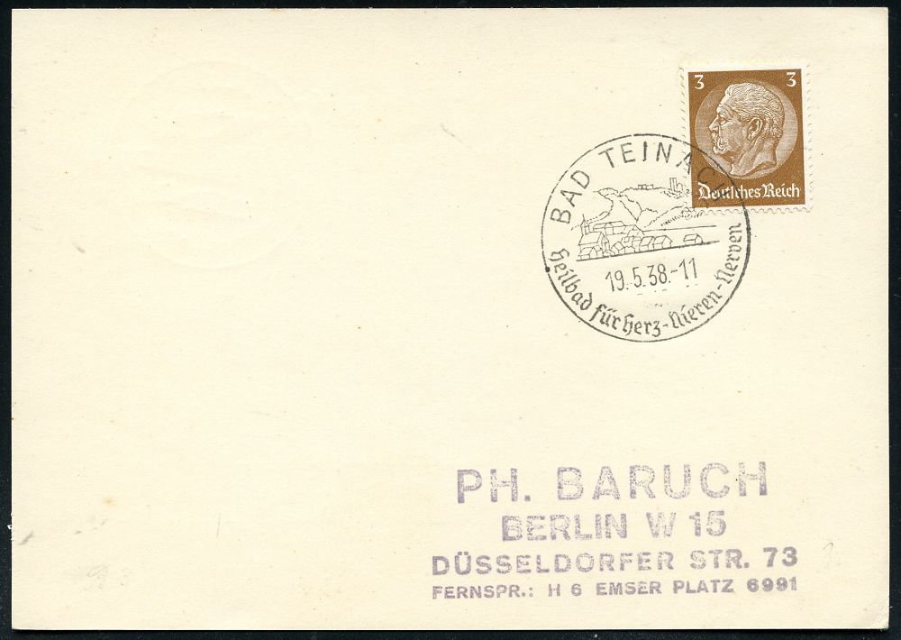 4229 | 12 € | POSTLEITRAUM 7200 (OHNE TUTTLINGEN) : BAD TEINACH/ Heilbad für Herz-Nieren-Nerven 1938 (19.5.) HWSt (Ortsbild)klar auf Inl.-Karte (Bo.3, Erstjahr) | ![]() | |