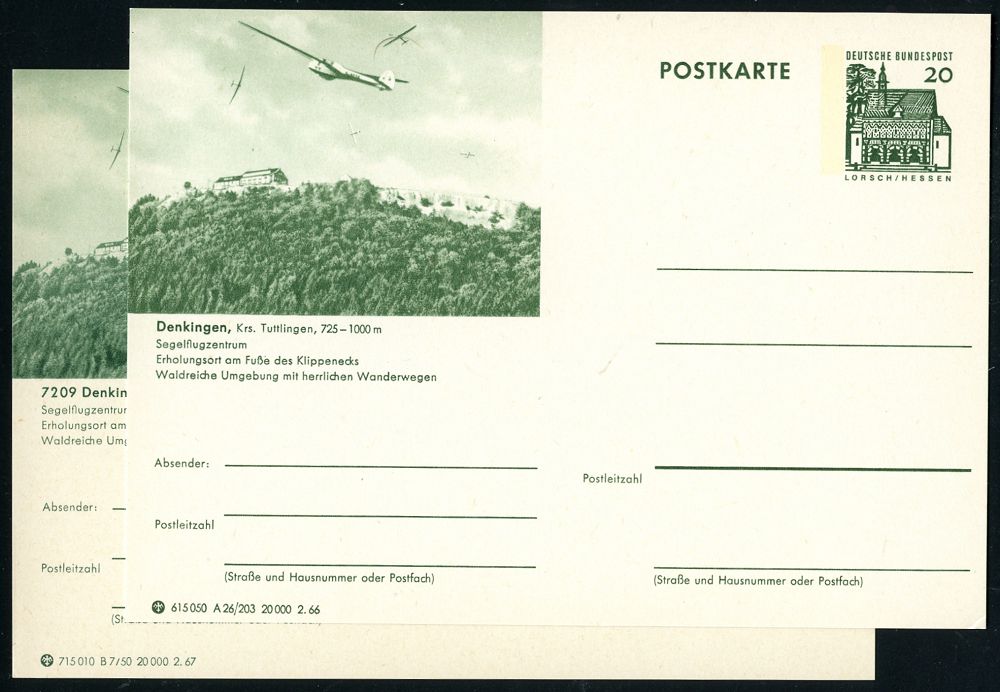 4246 | 10 € | POSTLEITRAUM 7200 (OHNE TUTTLINGEN) : Denkingen 1966/67 20 Pf. BiP Lorsch, grün: Segelflugzentrum.. in 2 Druck-Varianten: je Segelflugzeuge, je ungebr. (Einzelverkauf möglich: je 6.- EUR) 2 Belege (Mi.P 89, P 91) | ![]() | |
