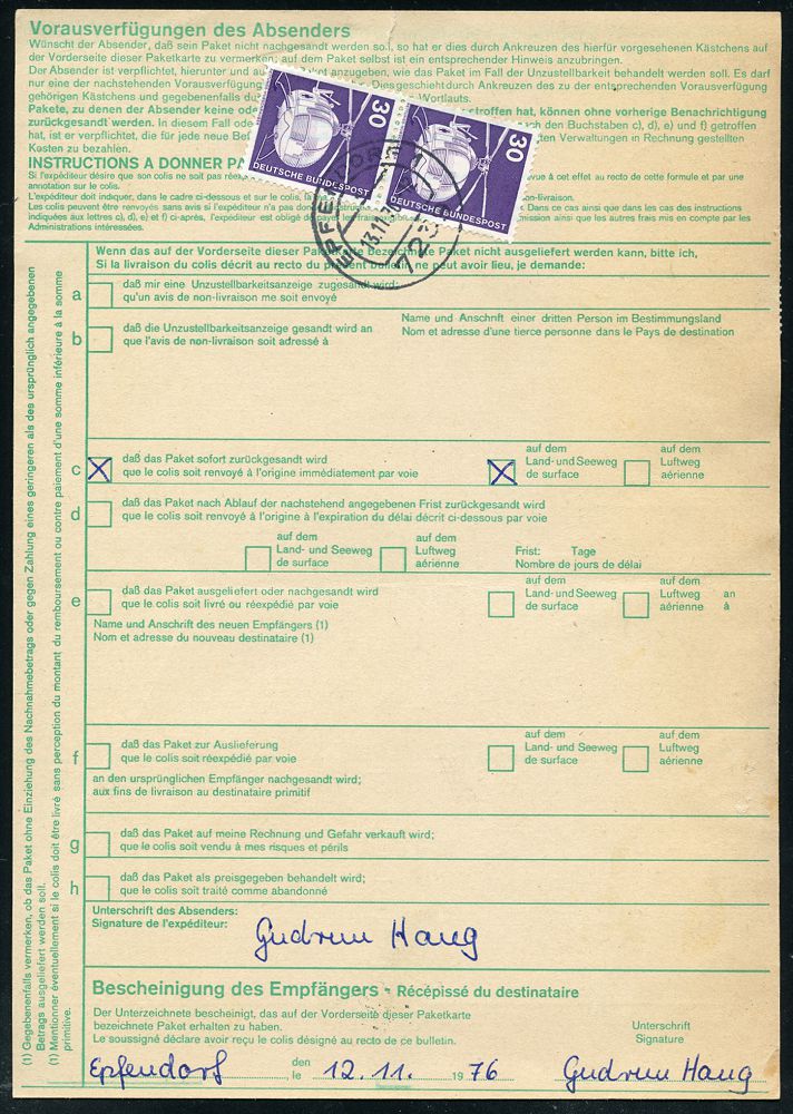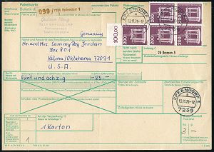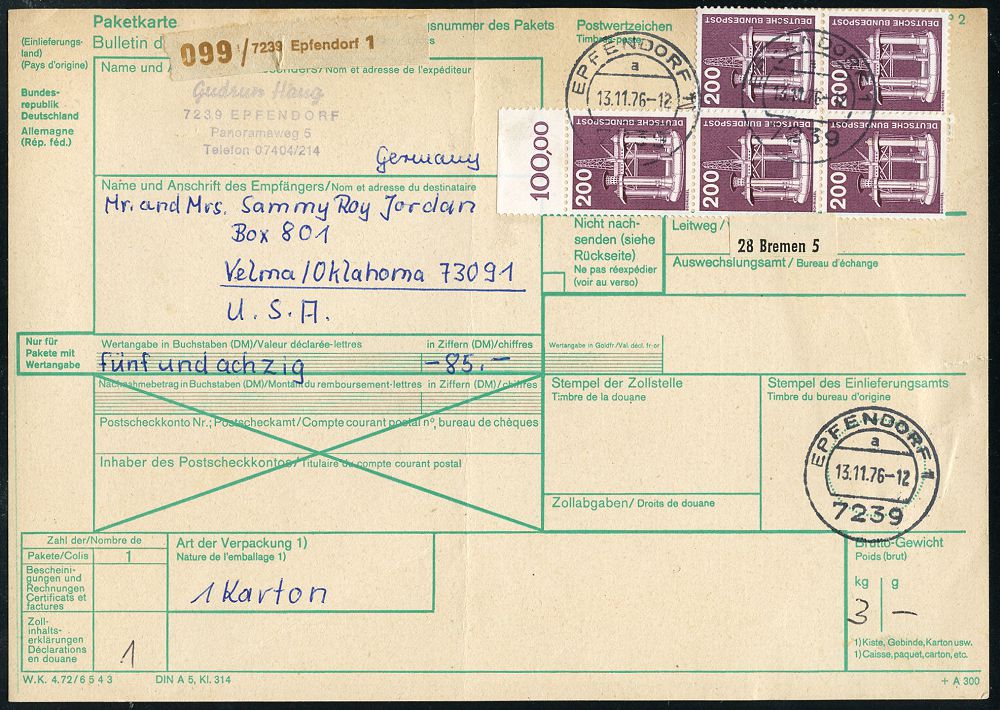 4251 | 15 € | POSTLEITRAUM 7200 (OHNE TUTTLINGEN) : 7239 EPFENDORF 1/ a 1976 (13.11.) 1K-Segment auf 5er-Block Technik Bohninsel + rs- 2x 30 Pf. Technik + brauner Paketzettel: 7239 Epfendorf 1, Ausl.-Paket-Kt. (übliche Mittelfalte) n. USA, seltene Portostufe 1060 Pf. (Mi.858 5x u.a. rs.) | ![]() ![]() | |