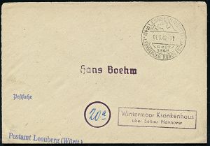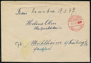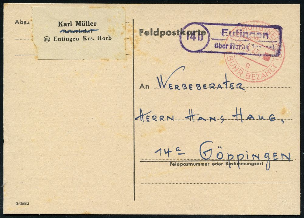 4252 | 18 € | POSTLEITRAUM 7200 (OHNE TUTTLINGEN) : (14b) Eutingen/ über Horb (Neckar) 1947 (31.5.) viol. Ra.2 = PSt.II + roter 1K-Brücken-PFS: (14) HORB (NECKAR)/g/ GEBÜHR BEZAHLT , aptierte Feldpostkt. in ziviler Nutzung, Fern-Barfrankatur-Kt. n. Göppingen (Dü.A-7, Nr.28) | ![]() | |