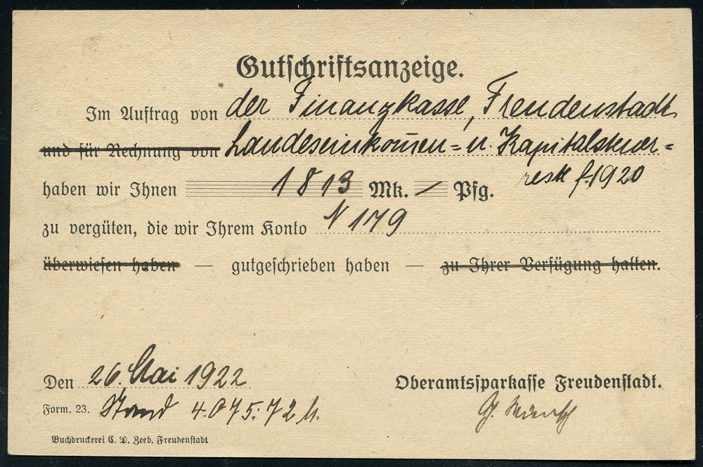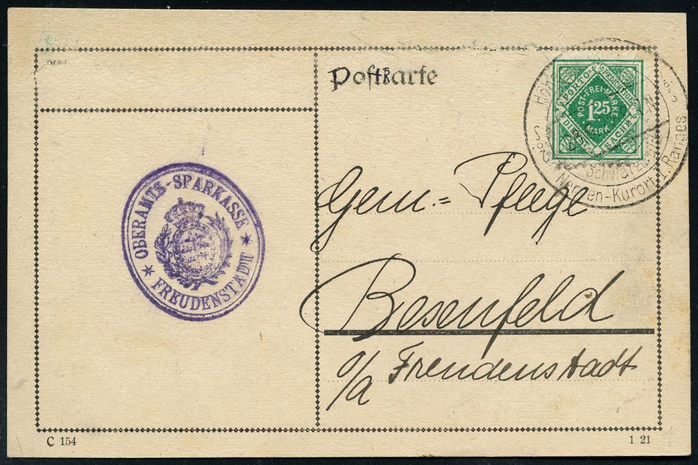 4254 | 20 € | POSTLEITRAUM 7200 (OHNE TUTTLINGEN) : FREUDENSTADT/ Schwarzwald/ ..Nerven-Kurort I.Ranges 1922 (26.5.) HWSt auf EF Württemberg Dienst 1,25 Mk., grün (Mi.D 156 EF + 40.- EUR) + viol. Oval-HdN: OBERAMTS SPARKASSE FREUDENSTADT (Wappen), Fern-Dienst-Kt. n. Besenfeld (Dü.2 , nur 1922-23 verwendet) | ![]() ![]() | |