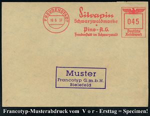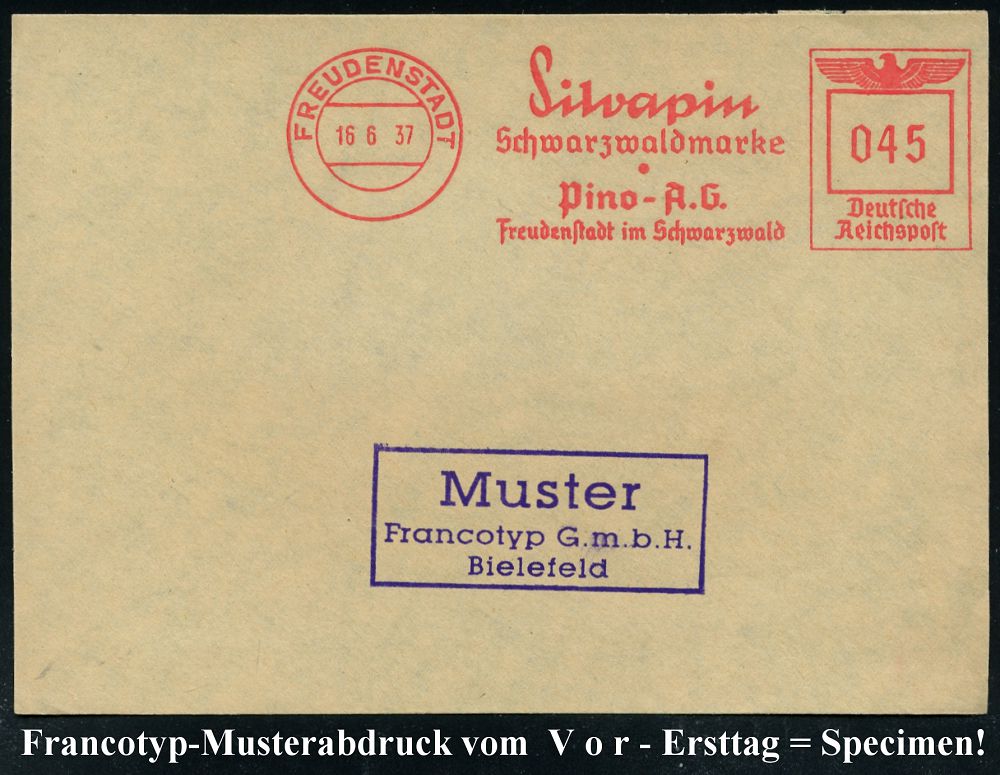 4257 | 35 € | POSTLEITRAUM 7200 (OHNE TUTTLINGEN) : FREUDENSTADT/ Silvapin/ Schwarzwaldmarke/ Pino-A.-G... 1937 (16.6.) AFS-Musterabdruck Francotyp "Reichsadler" , glasklar gest. Francotyp-Musterblatt vom V o r - Ersttag! (mit Attest), selten! (Dü.E-5CGo) | ![]() ![]() | |