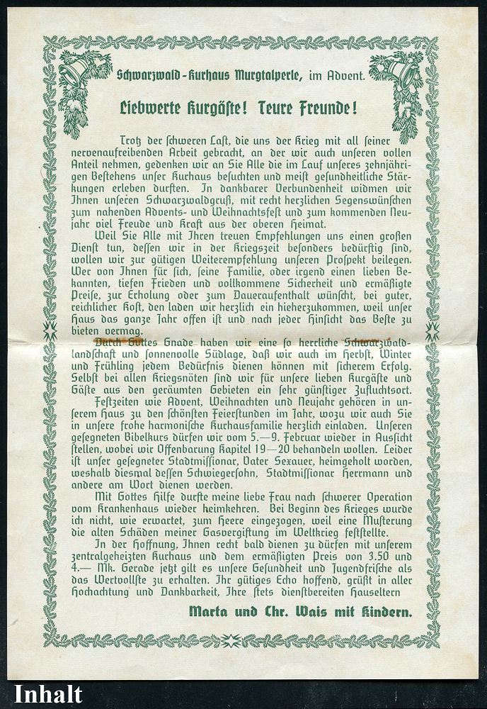 4261 | 28 € | POSTLEITRAUM 7200 (OHNE TUTTLINGEN) : FREUDENSTADT/ Deutsches/ Reich 1939 (3.12.) PFS "Hakenkreuz/Adlerkopf" 3 Pf. auf Reklame-Bf: Schwarzwald-Kurhaus "Murgtalperle".. VEREIN CHRISTLICHER HOSPIZE mit Abb. der Landschaft + Logo + Inhalt: Weihnachts-Info zum II. Weltkrieg etc., 2 Belege kompl., selten! (Dü.D-6) | ![]() ![]() | |